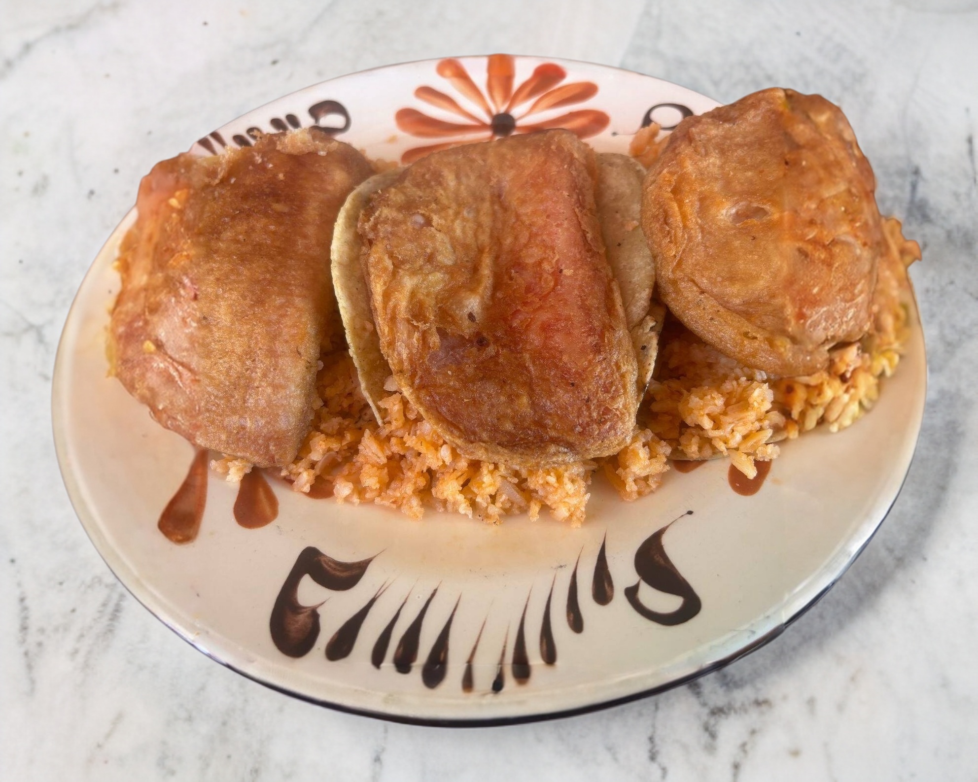 3 Tacos de papa servidos con arroz y tortilla de maiz.
