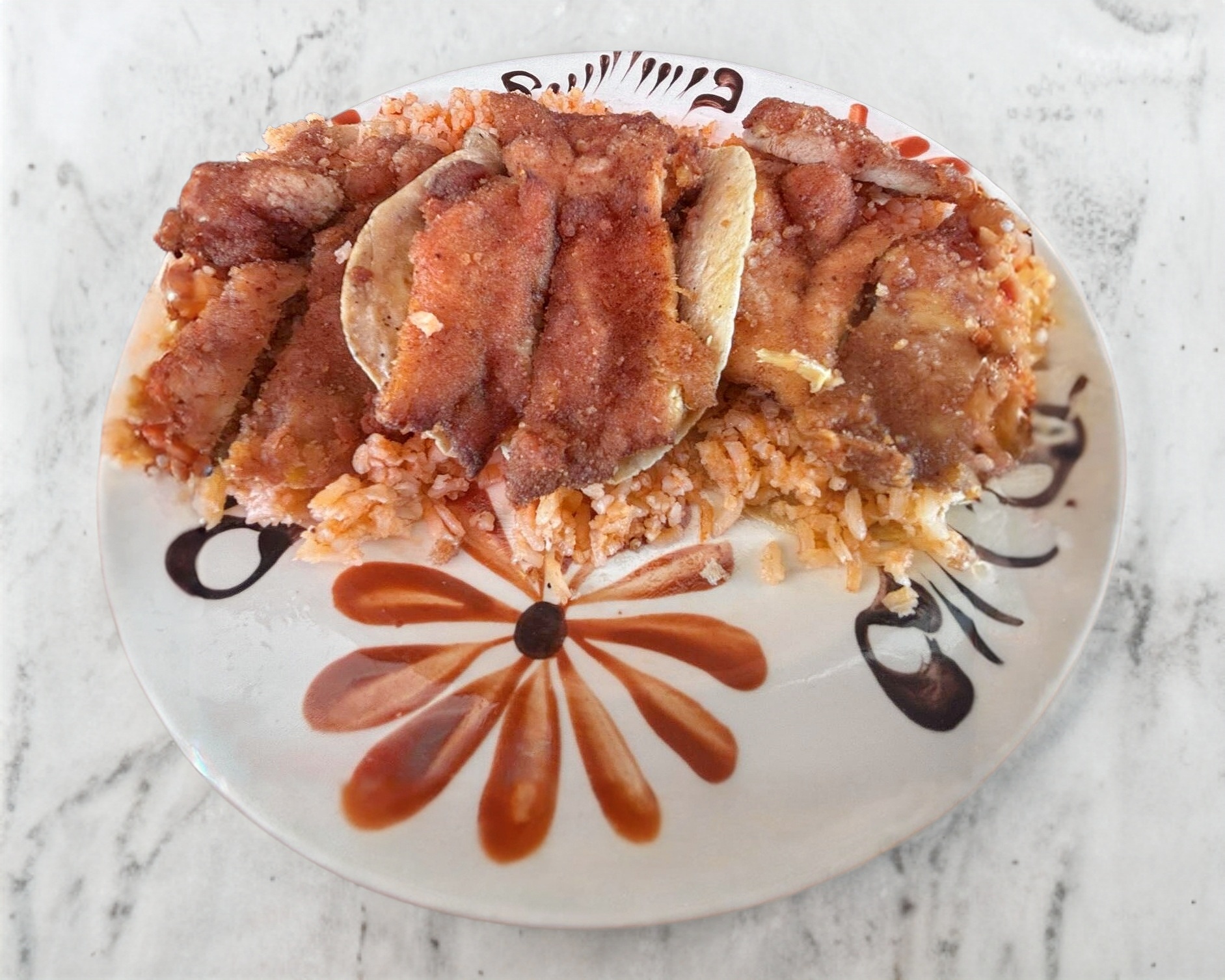 3 Tacos de milanesa de pollo servidos con arroz y torilla de maiz.