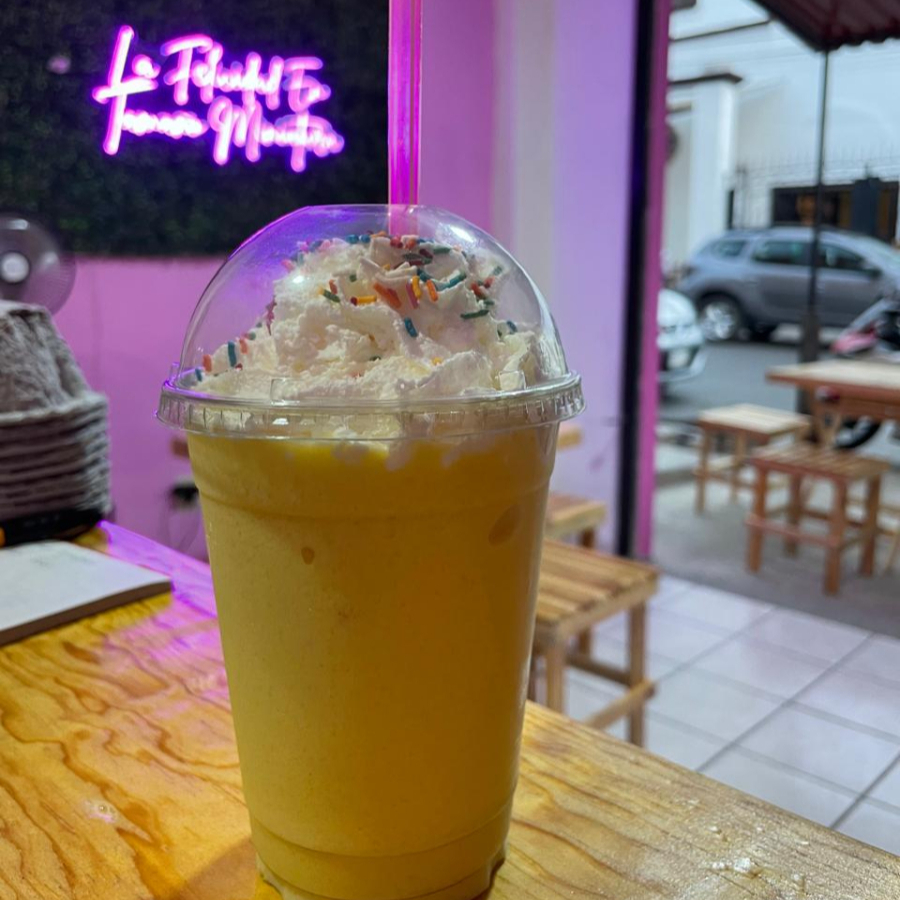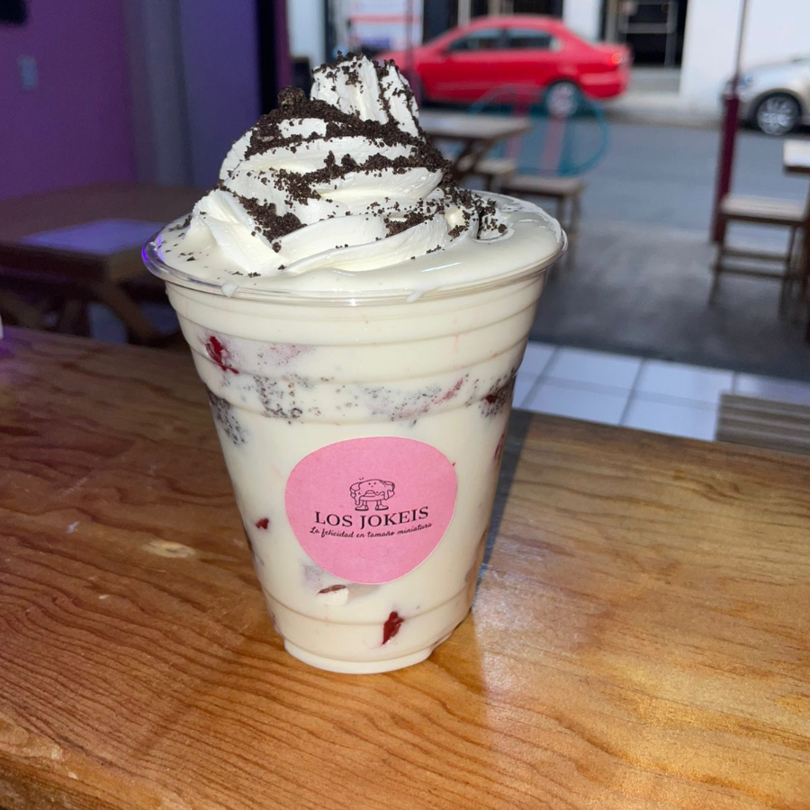 Vaso de 14oz con fresas frescas con crema cremocita y dulce, acompañada de crema batida y 1 toppings