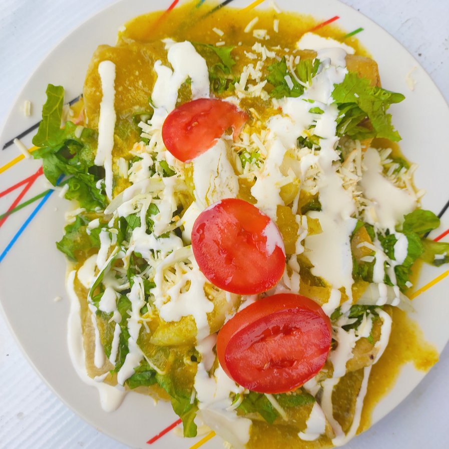 Tortilla rellena (ingrediente a elegir) , bañada en salsa verde acompañada con lechuga, jitomate, queso y crema.