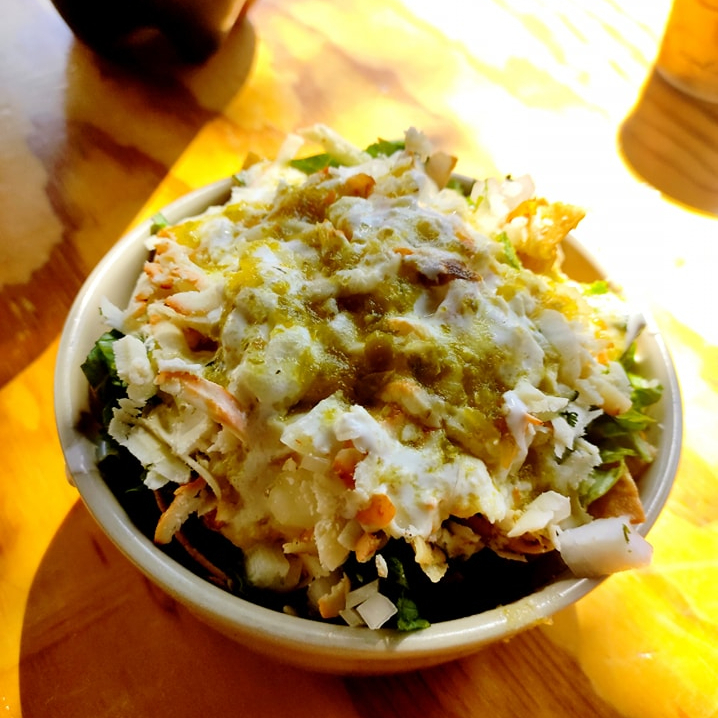 Tortilla dorada en aceite, con salsa verde, queso, crema, lechuga y pollo