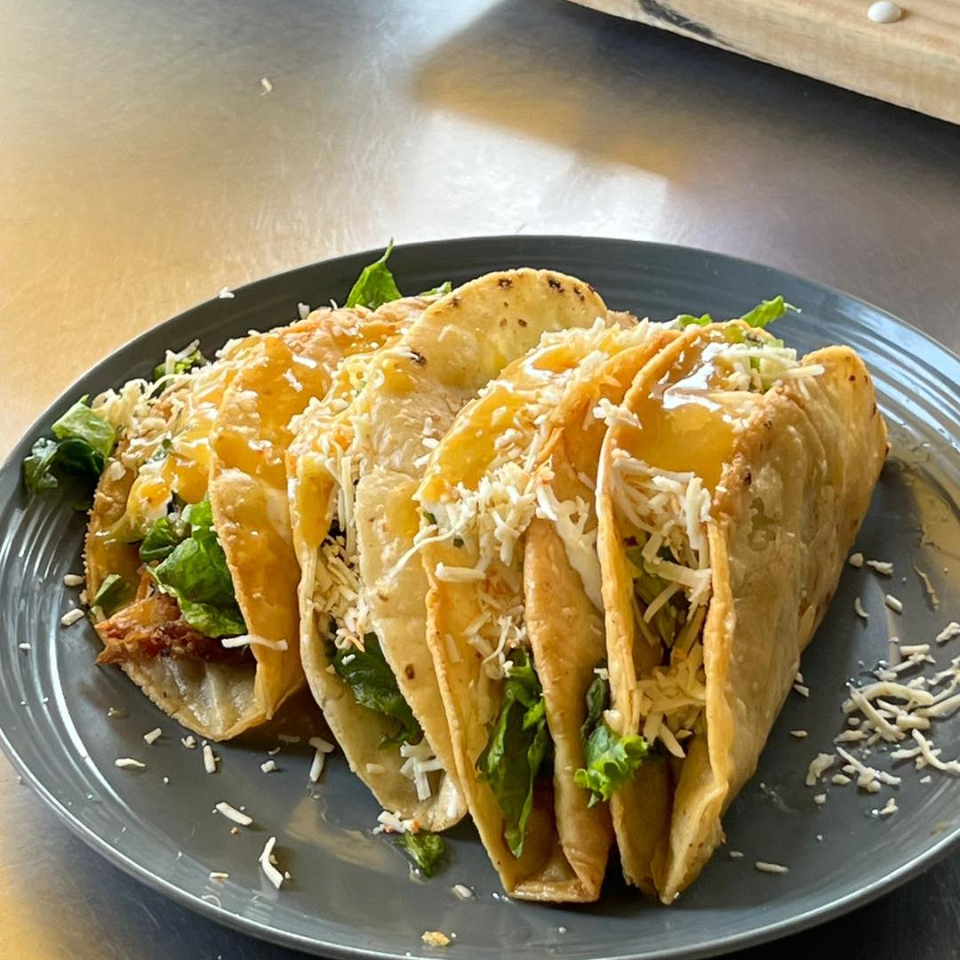 Tortilla doblada dorada en aceite, con relleno a elegir, queso, crema y lechuga