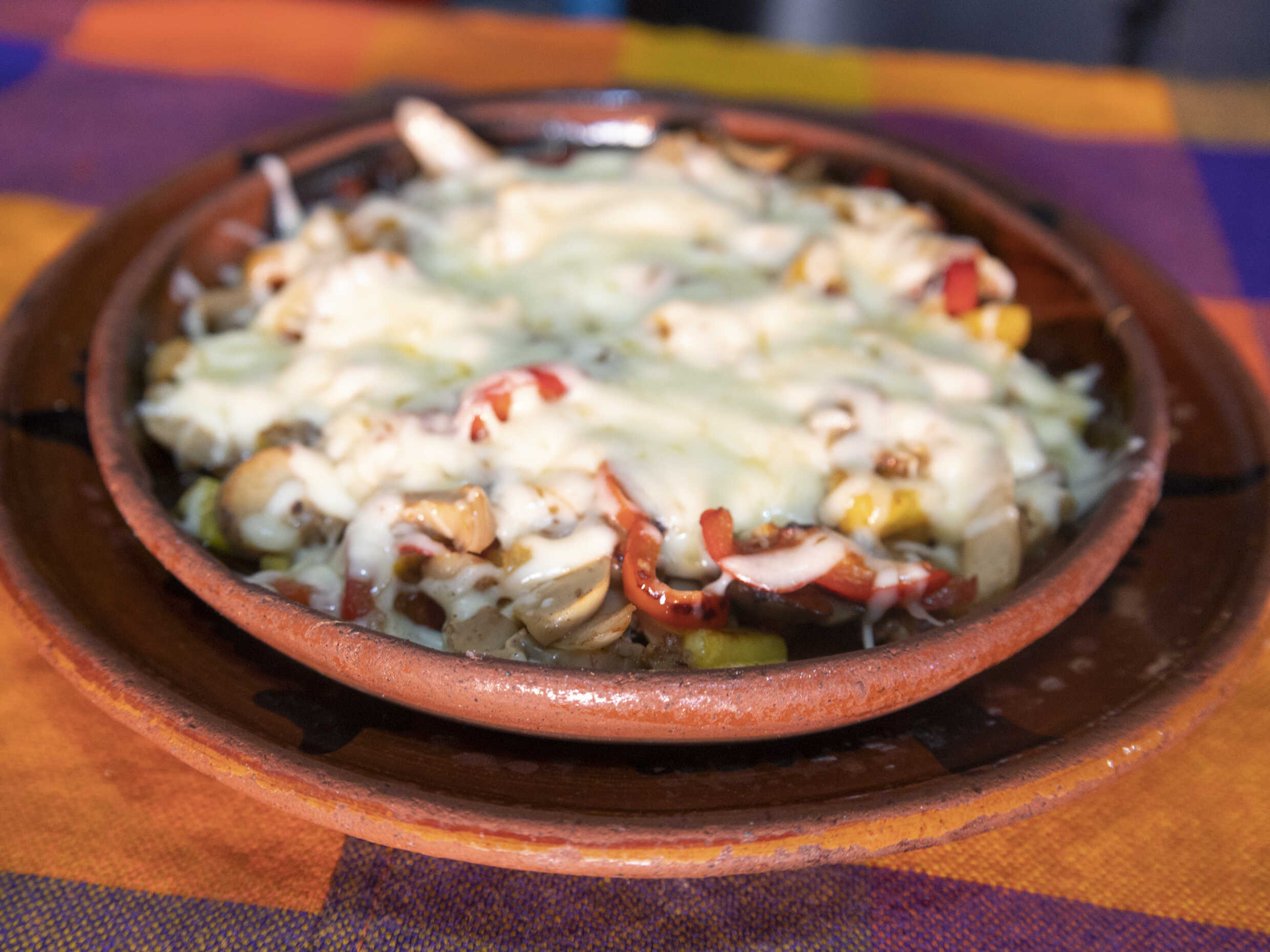 Alambre de pollo con morrón, cebolla y queso. Incluye tortillas de maíz.