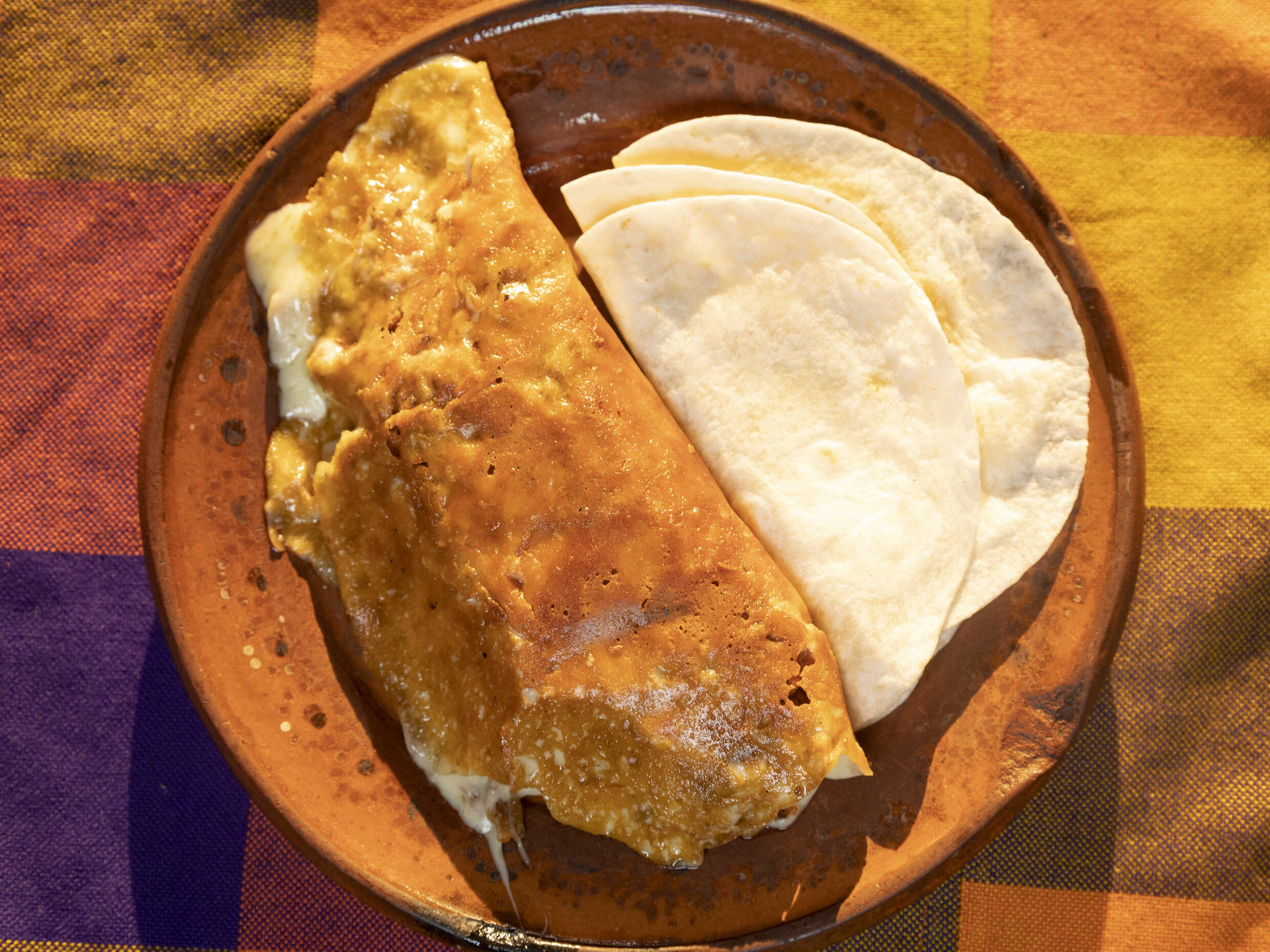 Costra de queso rellena de cecina. Incluye tortillas de harina.