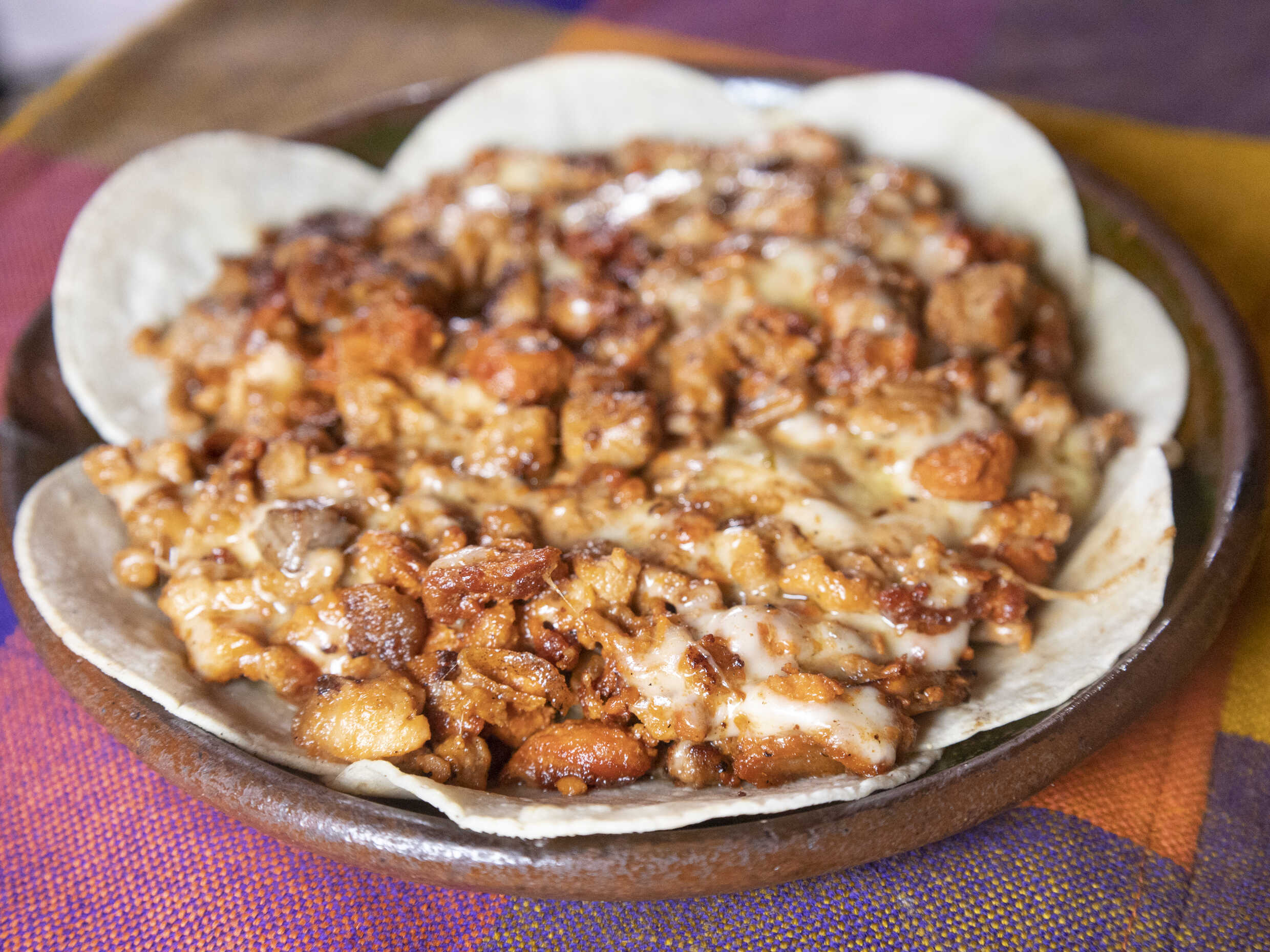 Costra de queso rellena de pollo. Incluye tortillas de harina.