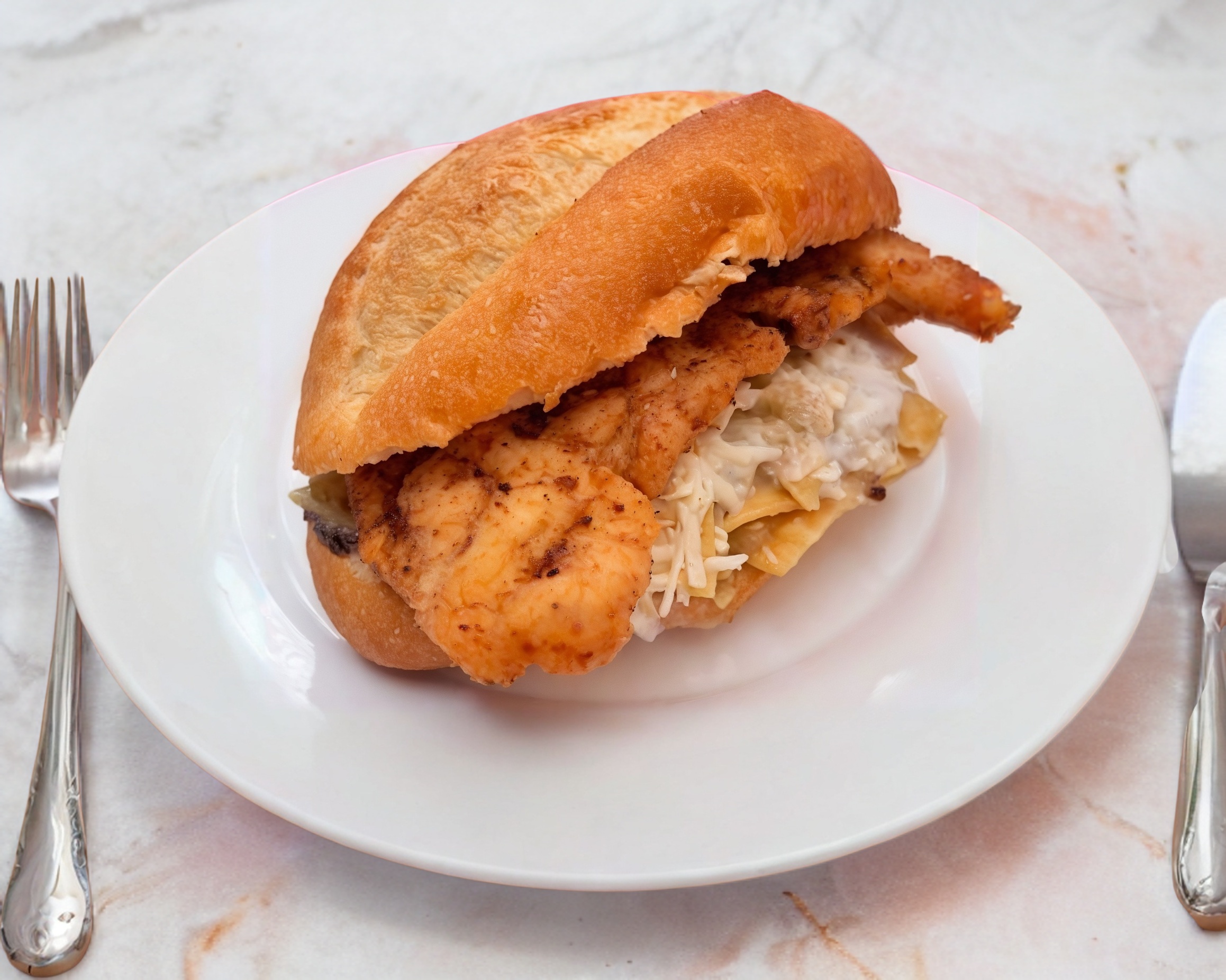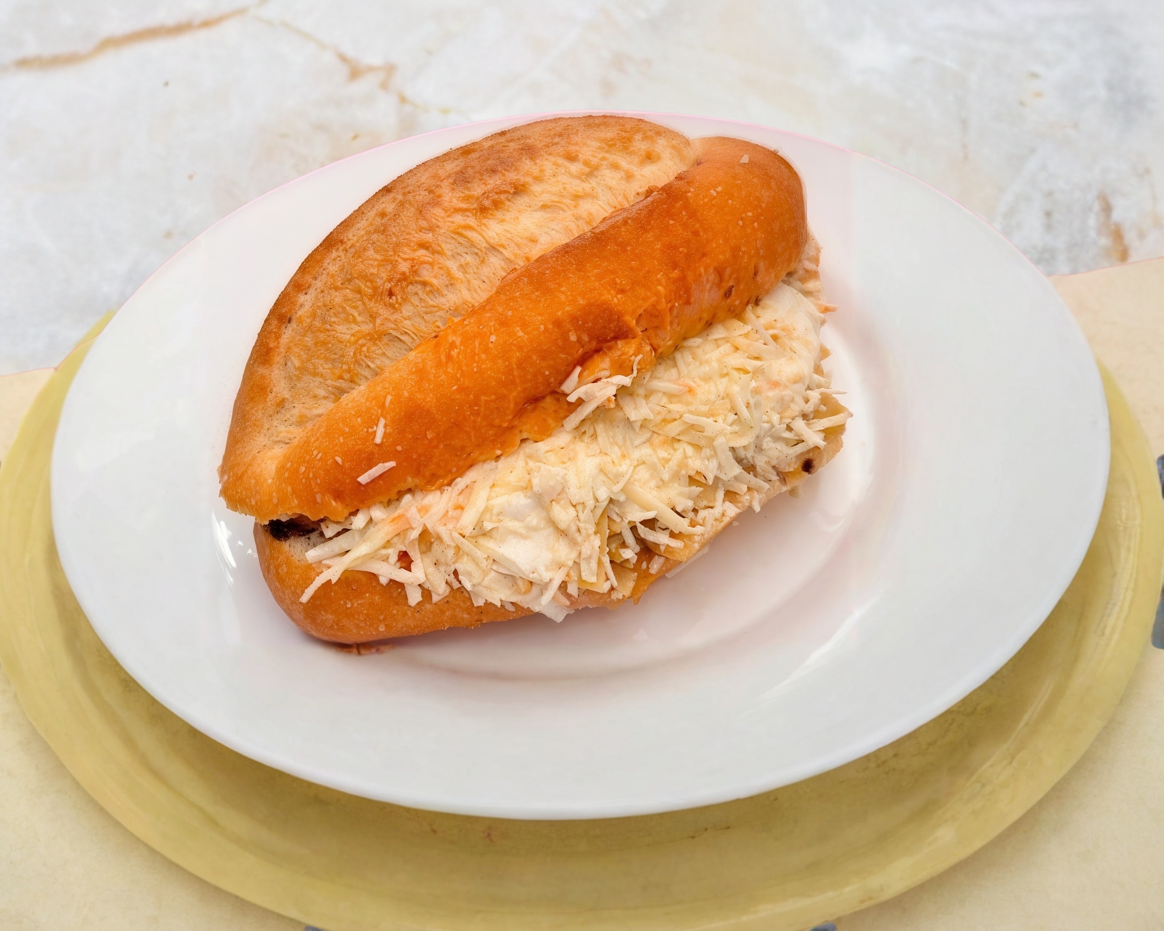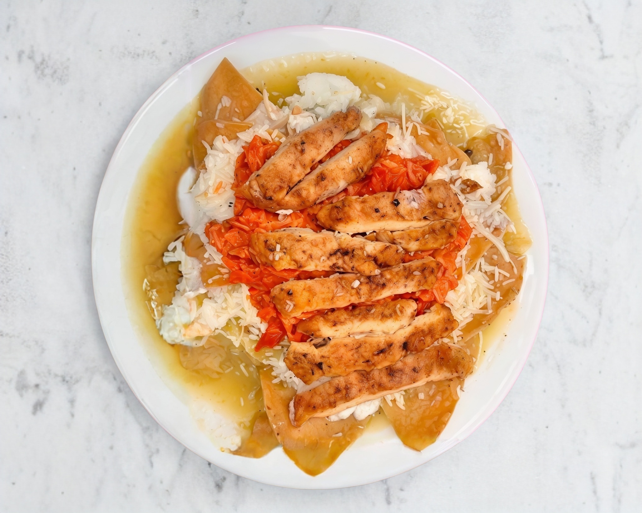 Bolillo con frijoles refritos, chilaquiles verdes o rojos, crema, queso rallado y carne de pollo deshebrada.
