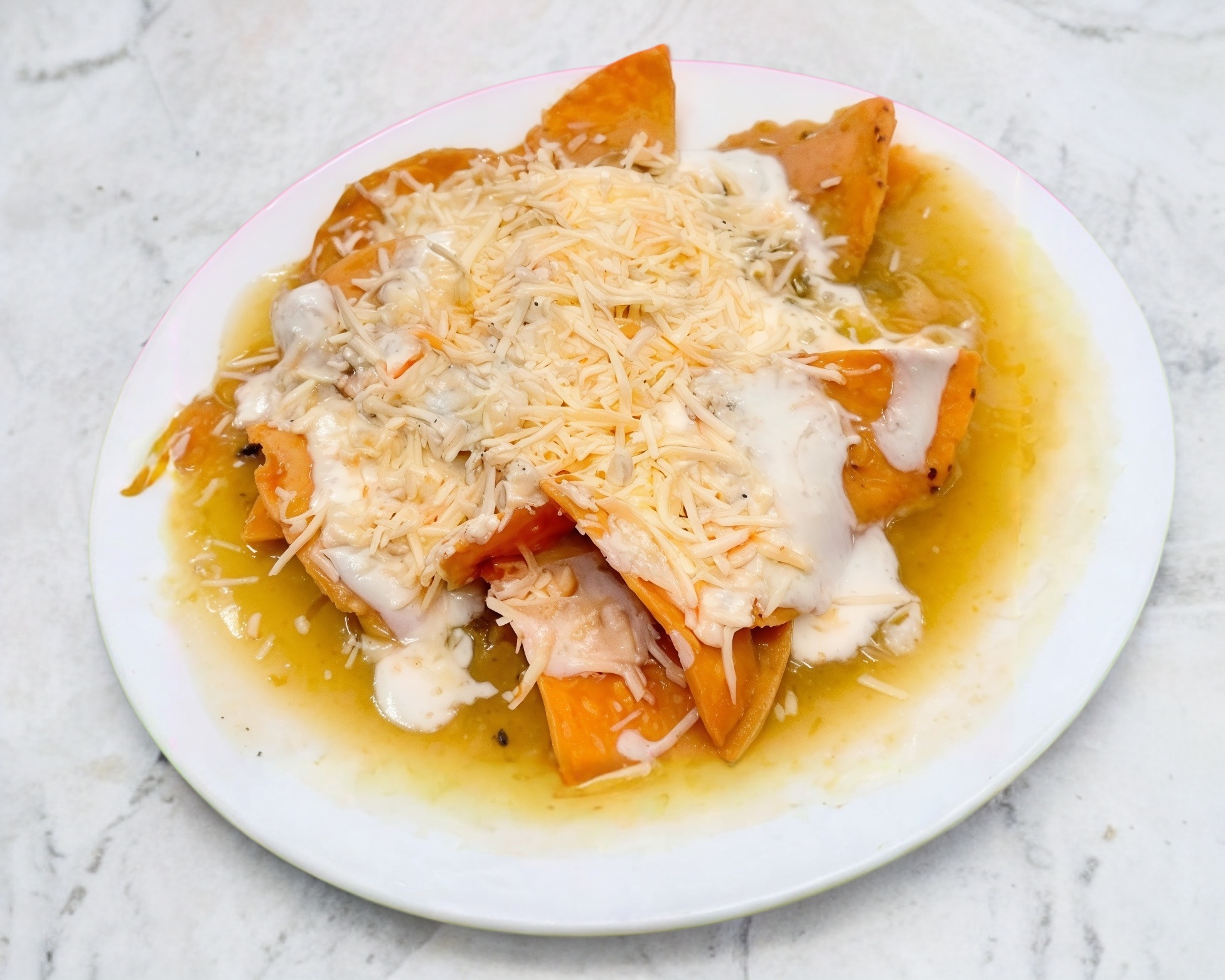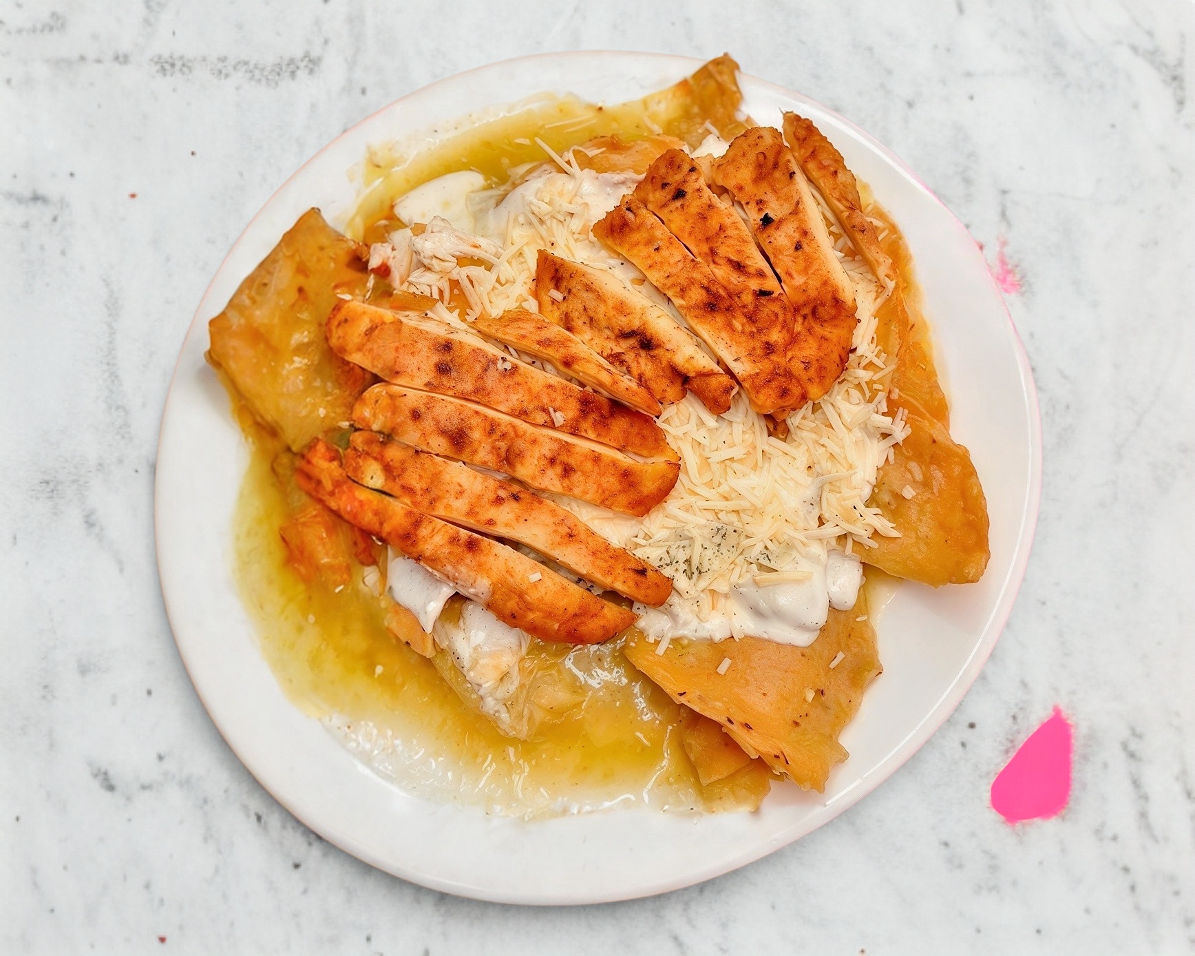 Plato Maily ( porcion personal ) Chilaquiles verdes o rojos incluye totopos de maiz acompañados de crema, queso de cincho rallado , milanesa de pollo y una porción de frijoles refritos.
