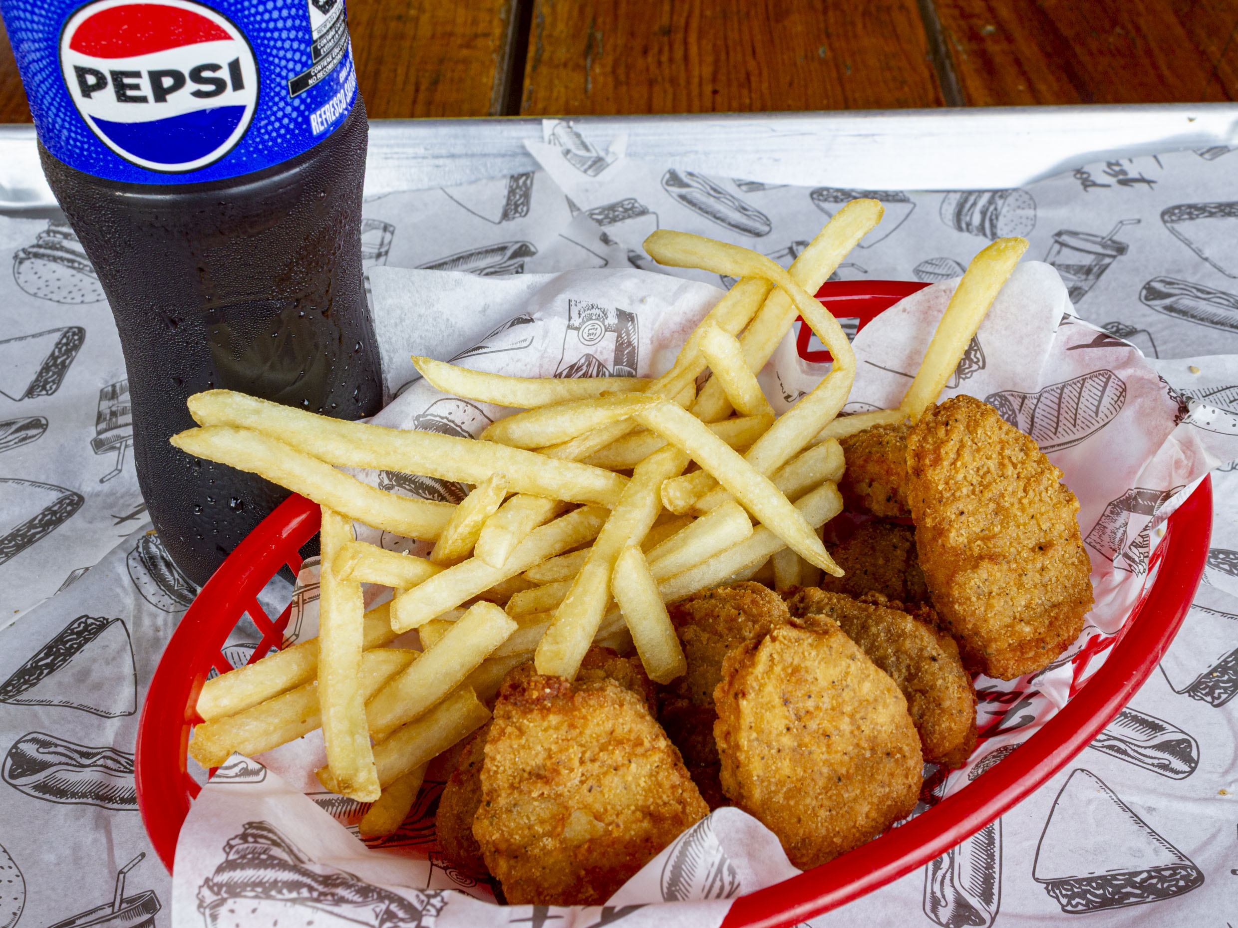 8 Nuggets. Incluye papas chicas y refresco chico.