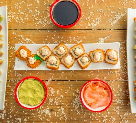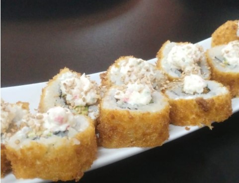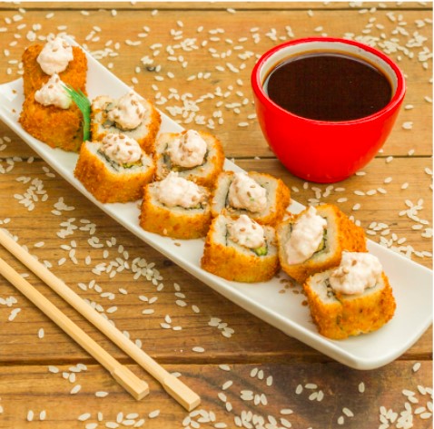 Pasta de cangrejo, aguacate por dentro, queso philadelfia por fuera, empanizado, servido con tampico, ajonjolí tostado, soya y chiles.