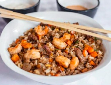 Arroz frito a la plancha, con verduras, filete de res y camarón, sazonado con la receta de la casa, preparado al momento.
