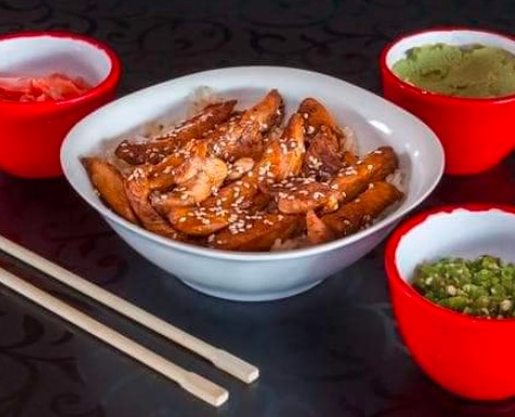Pollo a la plancha, sazonado con salsa teriyaki, acompañado de arroz y ajonjolí tostado.