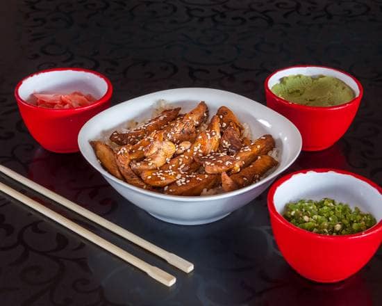 Pollo sazonado a la plancha con salsa teriyaki y arroz.