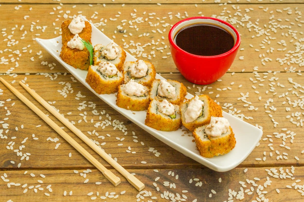 Pasta de cangrejo empanizado, queso Filadelfia y aguacate por dentro; kakiague por fuera; servido con salsa dulce y ajonjolí.