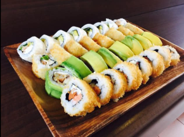 Camarón, pepino y aguacate por dentro; ajonjolí por fuera.