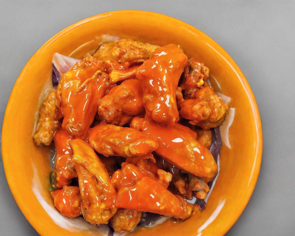 10pz de alitas bañadas en salsa Mango habanero acompañadas de aderezo tipo ranch y tiras de zanahoria fresca
