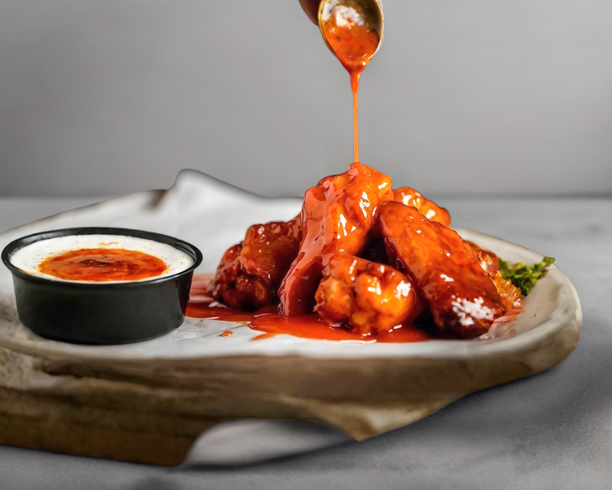 10pz de alitas bañadas en salsa búfalo acompañadas de aderezo tipo ranch y tiras de zanahoria fresca