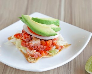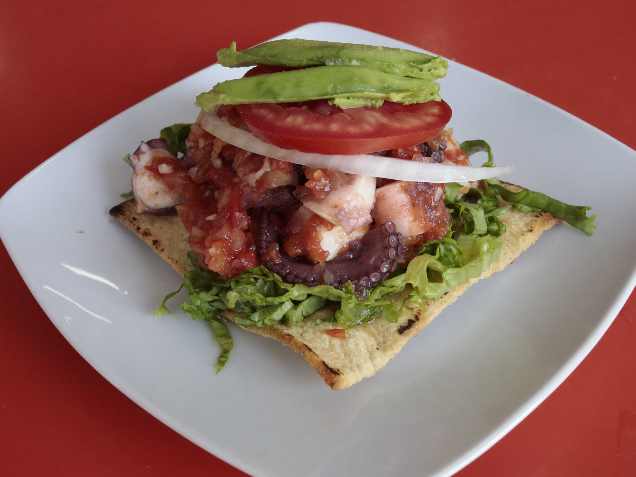 Tostada de pulpo a la mexicana, mayonesa, lechuga, jitomate, cebolla y aguacate