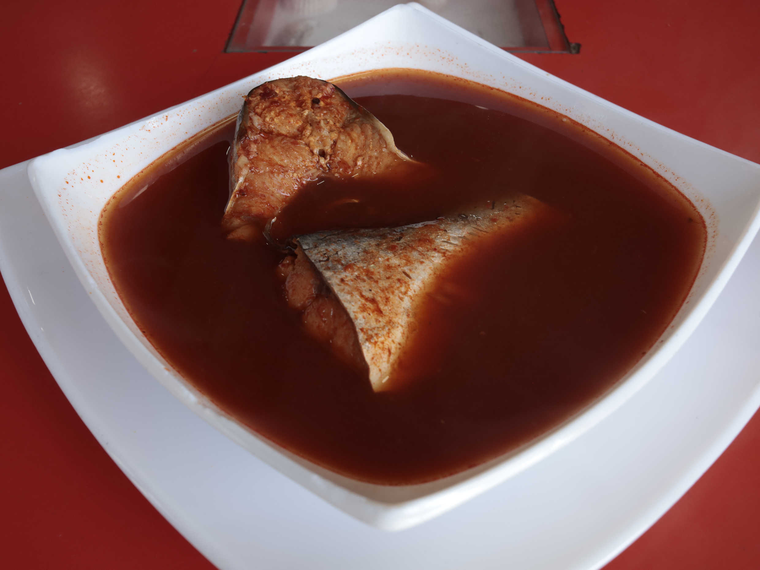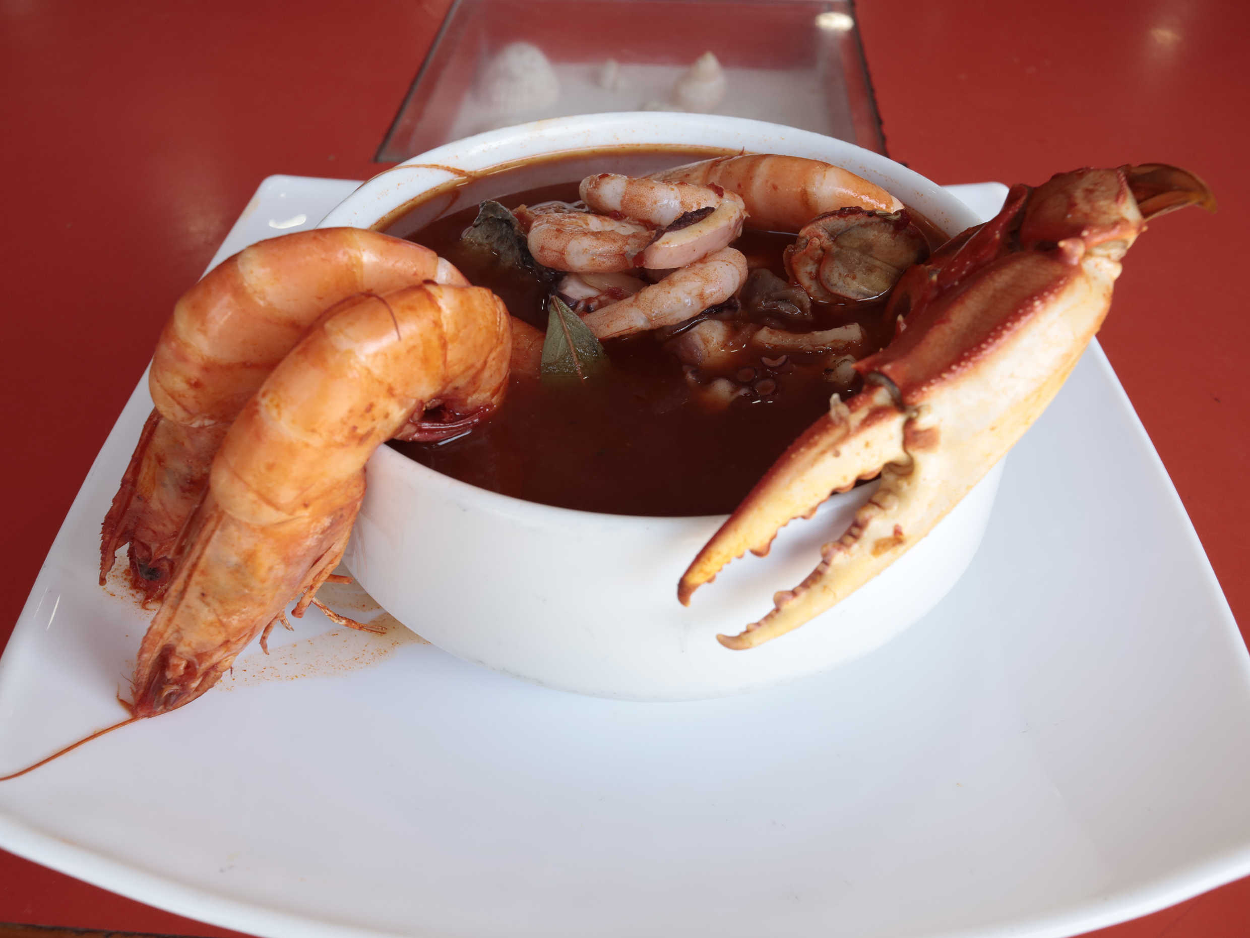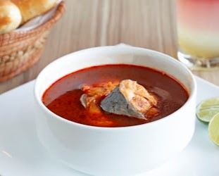500 ml Caldo a base de chile huajillo, 1 pedazo de pescado, media jaiba, 4 camarones y sopa de maricos (pacotilla, camaron, pulpo, mejillon, surimi)