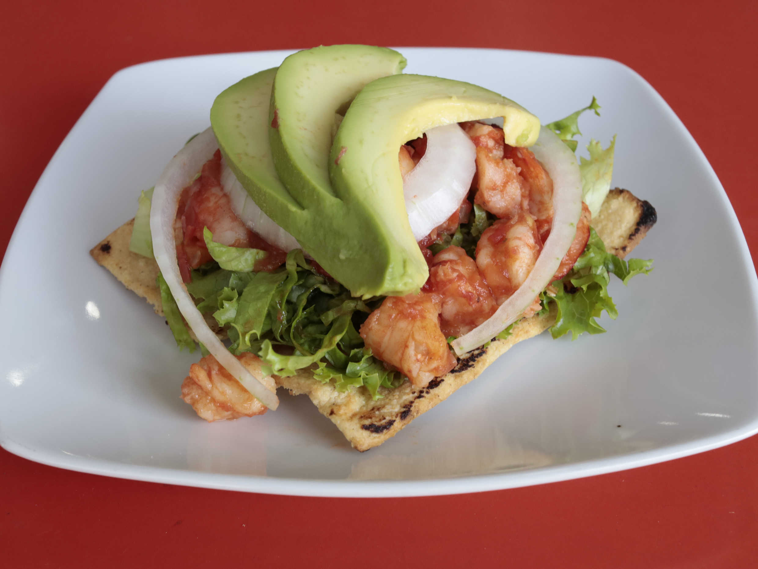 Tostada de camarón a la mexicana, mayonesa, lechuga, jitomate, cebolla y aguacate