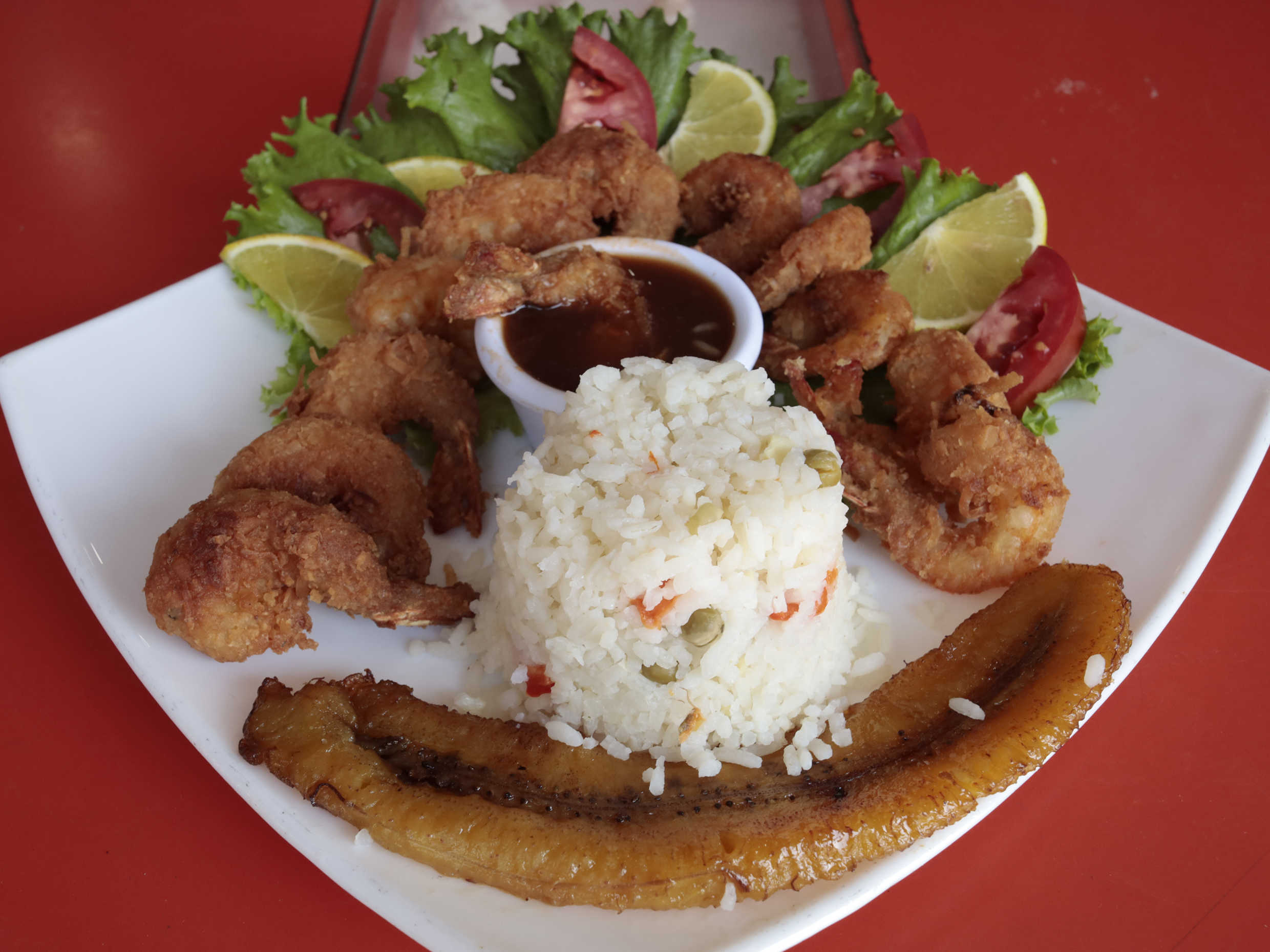 240 gr. De Camarones empanizdos con Coco, acompañados con salsa de tamarindo y arroz con platano