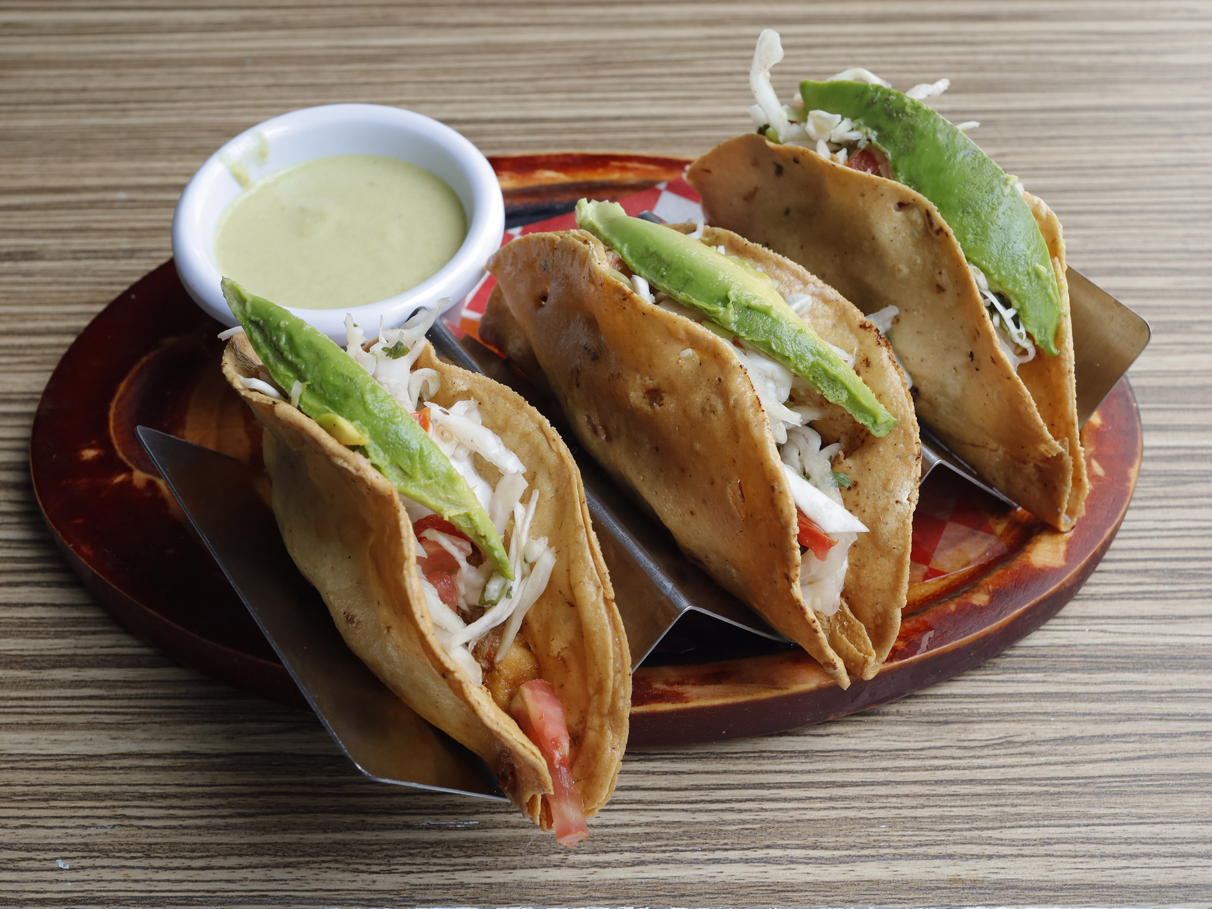 Hecha de masa de maiz rellana de Marlín acompañada con lechuga, crema y queso rayado