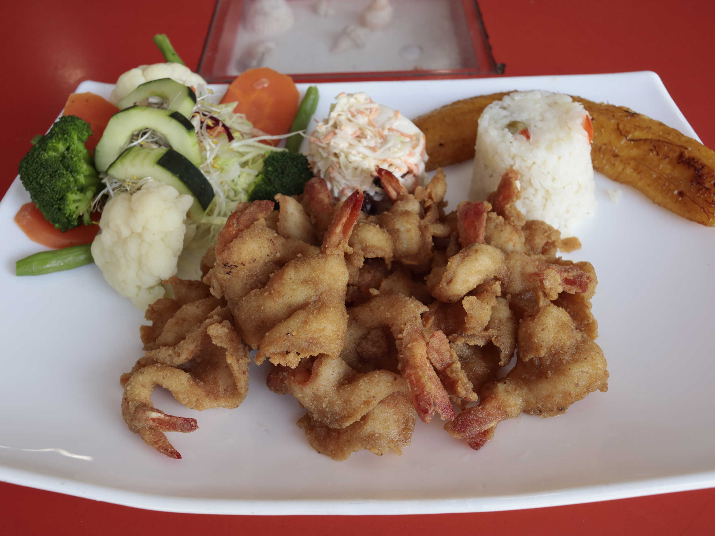240 gr. De Camarones empanizdos y guarnición de ensalada verde, ensalada dulce y arroz con platano