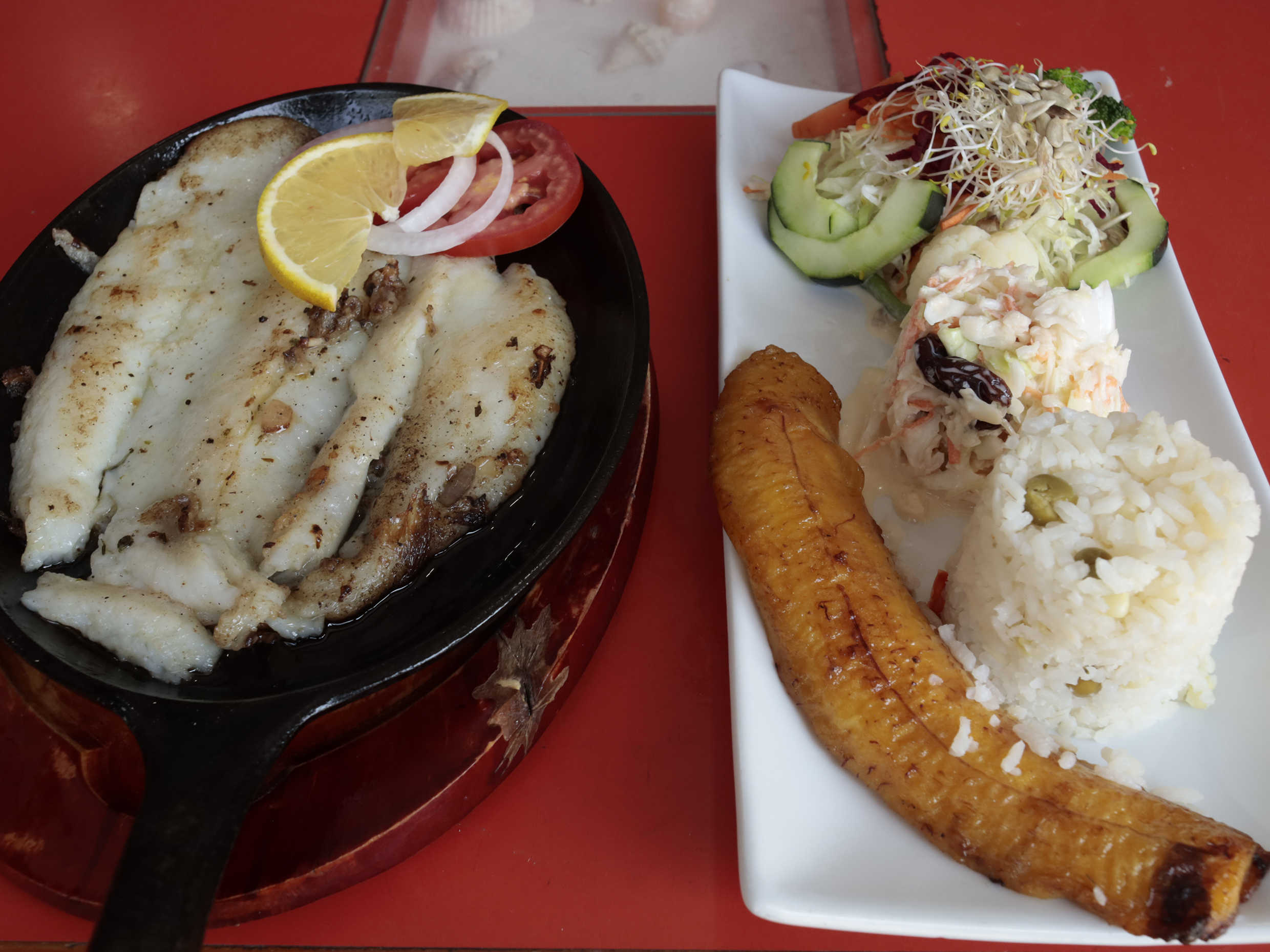 Ensalada dulce, ensalada verde y arroz con plátano.