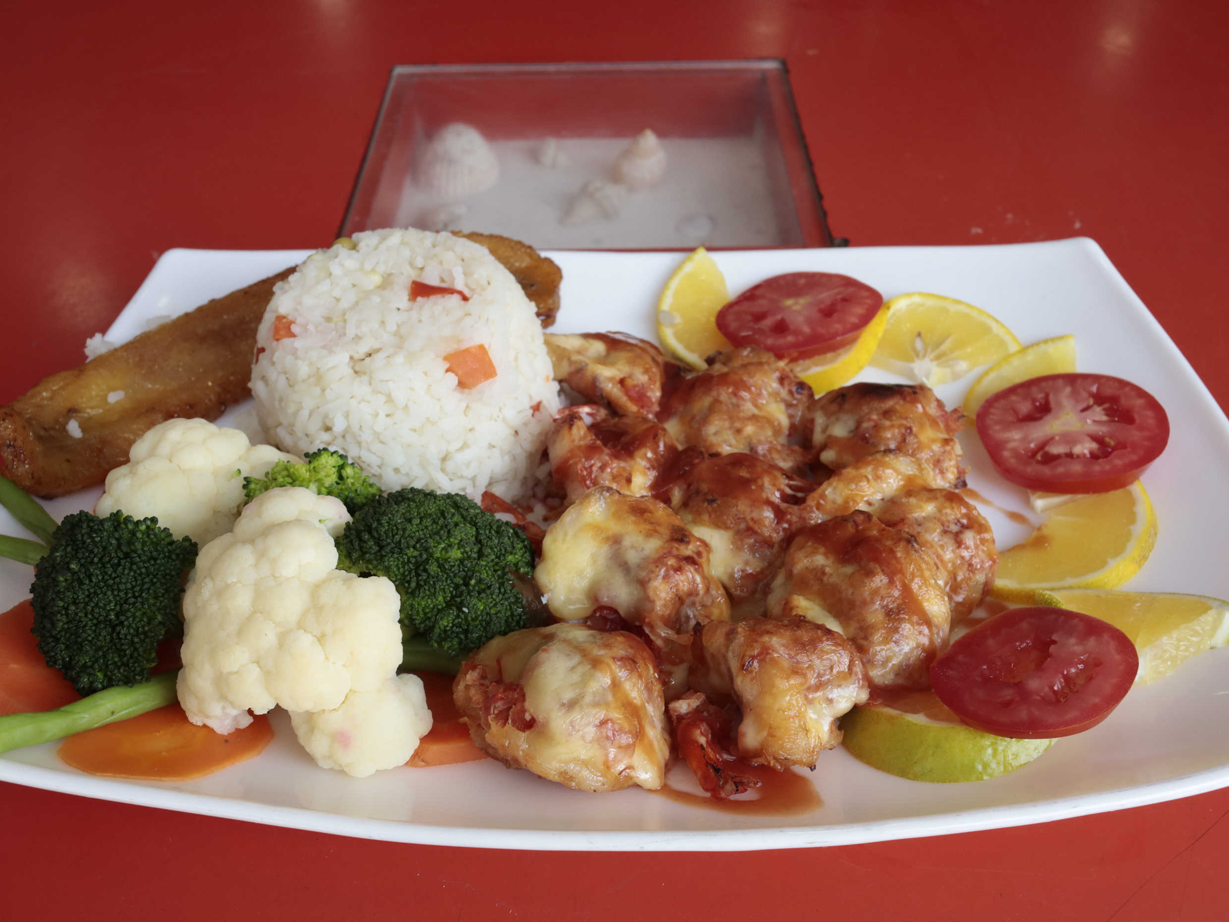 Media Piña rellena de alambre de Mariscos (Pulpo, Camarón, tocino, jamón, cebolla, pimiento morron, trozos de piña),gratinada con queso manchego, tortillas de harina y arroz con platano