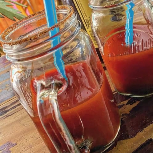 Clamato preparado con mineral y salsas negras Tajín