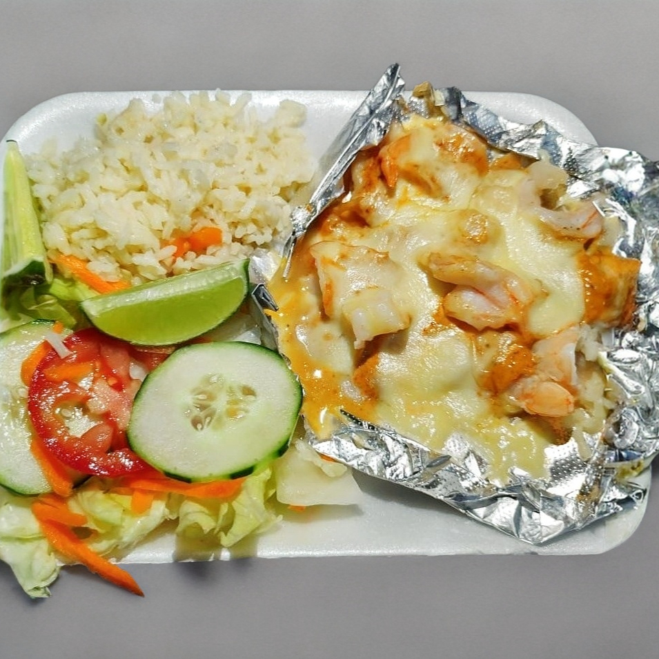 FILETITO DE PESCADO RELLENO DE DELICIOSO CAMARÓN O MARISCOS CON QUESO MANCHEGO Y LA INIGUALABLE RECETA DE LA CASA ACOMPAÑADA DE ARROZ Y ENSALADA "porción chica"