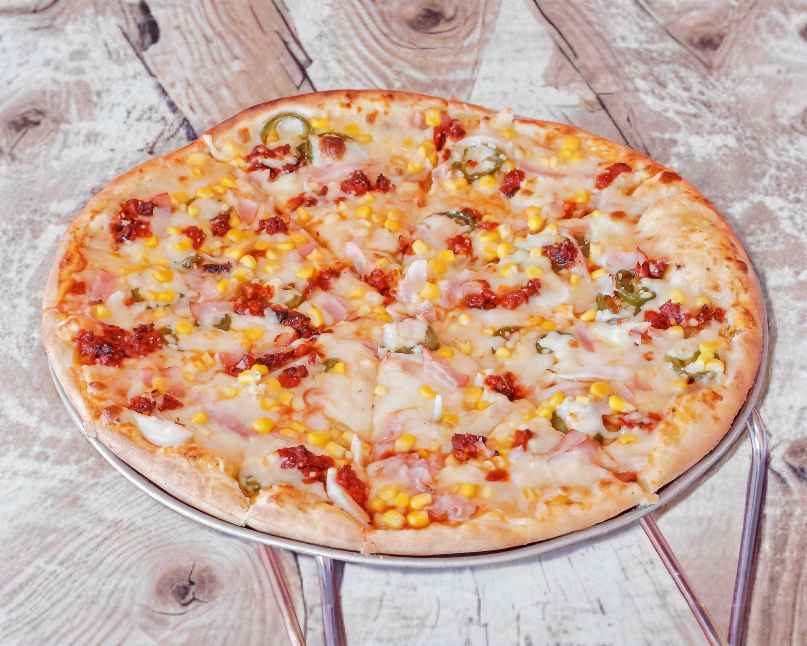 Cebolla, jalapeños, chorizo, tocino, chorizo y elote.