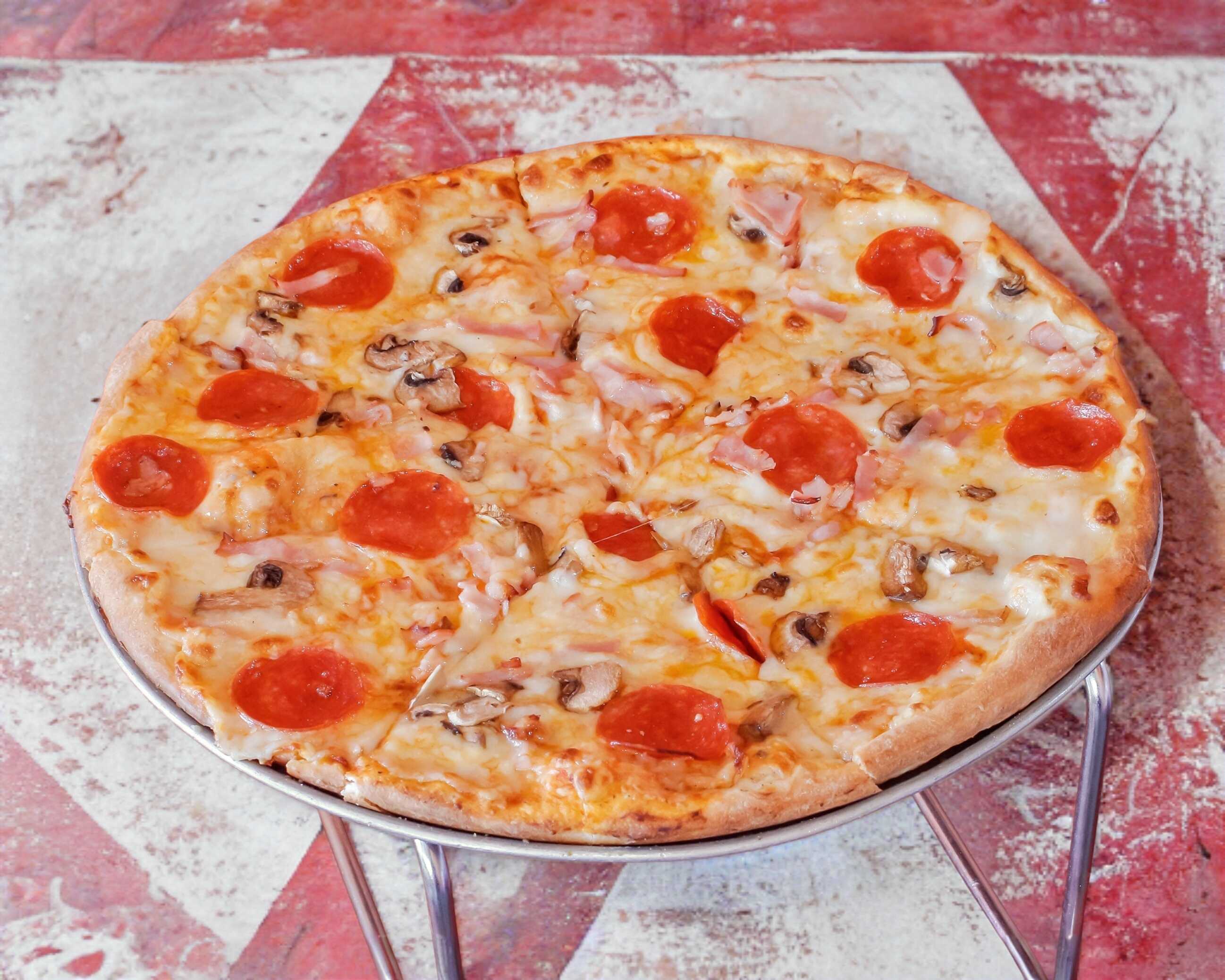 Pepperoni, tocino y champiñón.