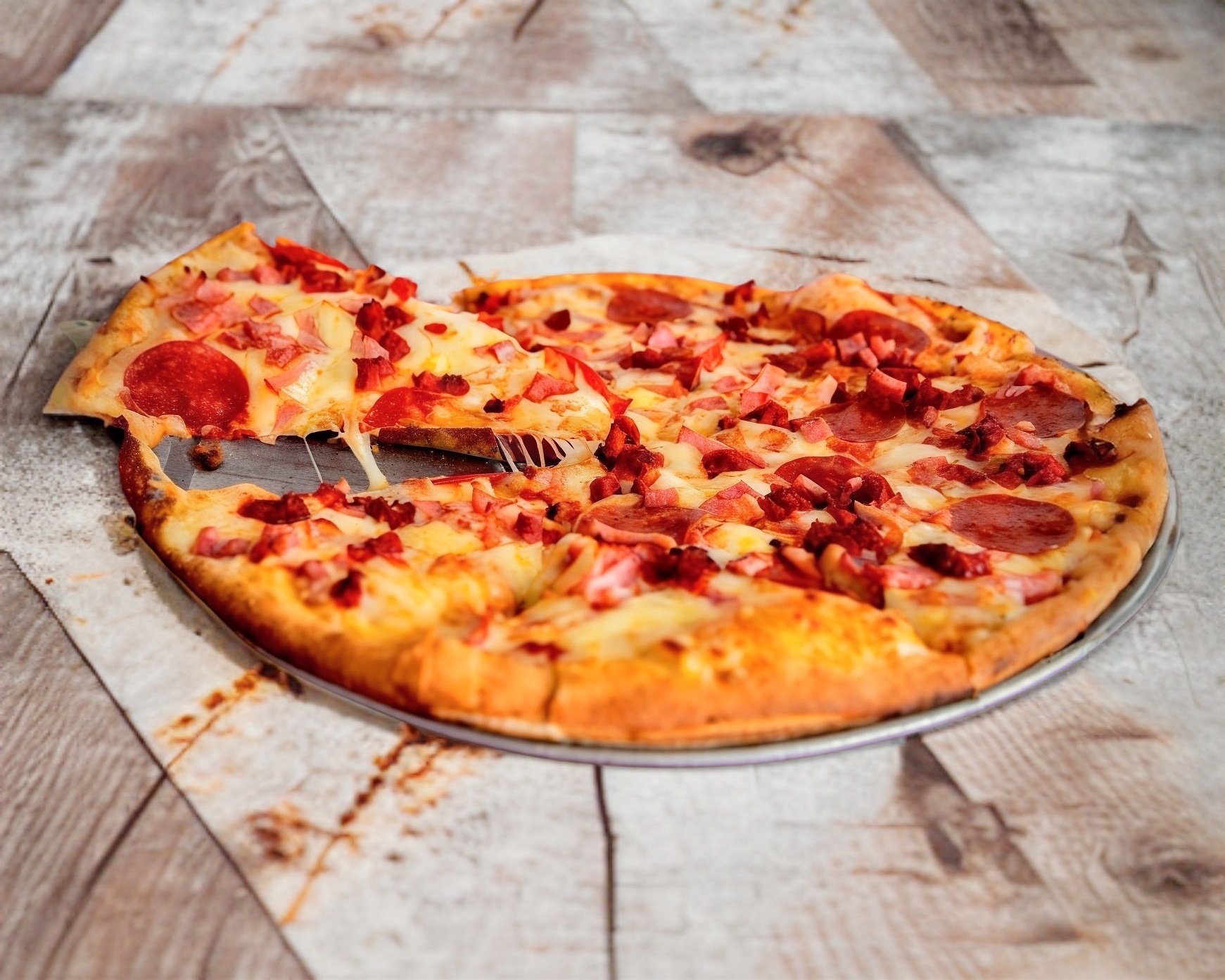 Pepperoni, salami, tocino y chorizo.