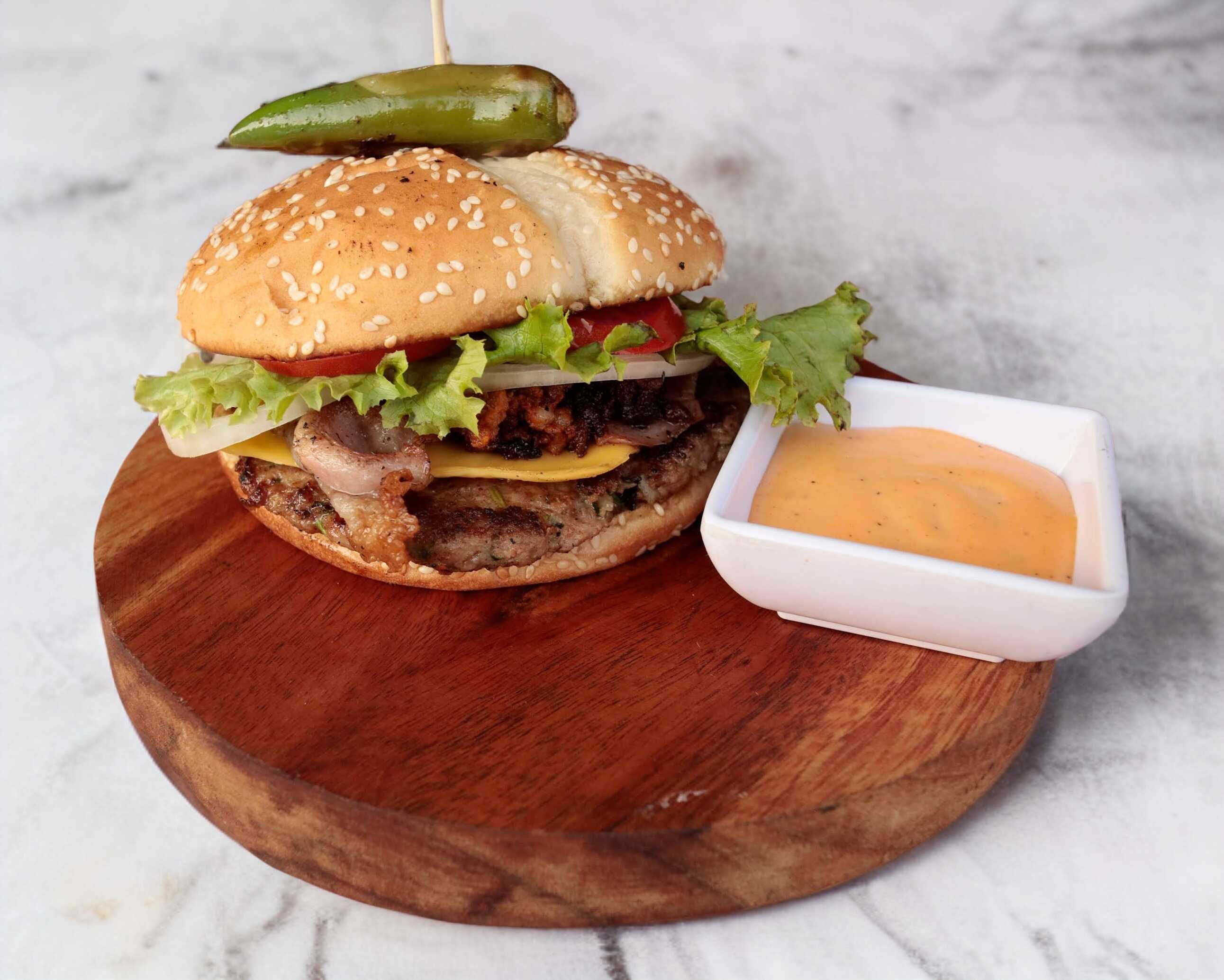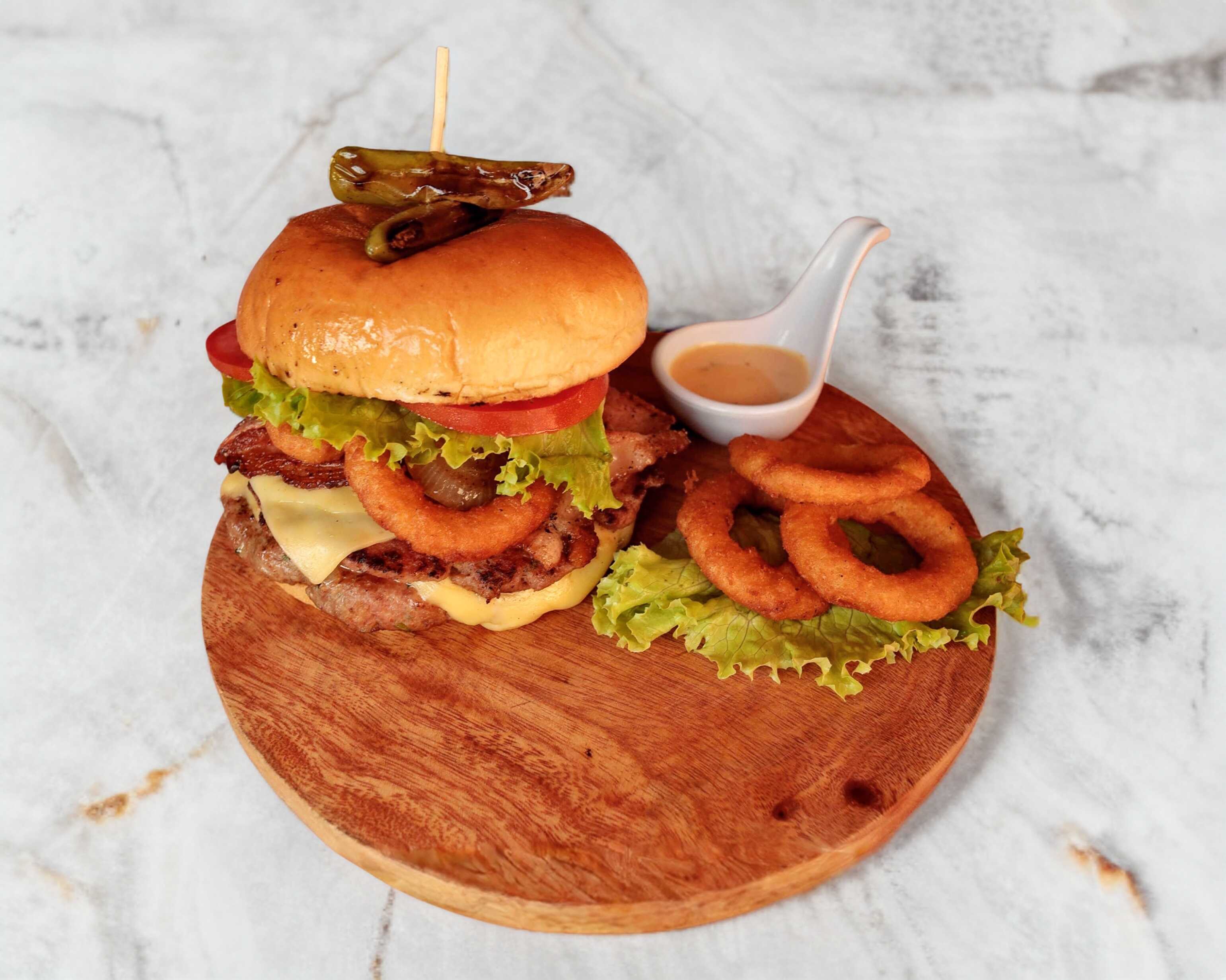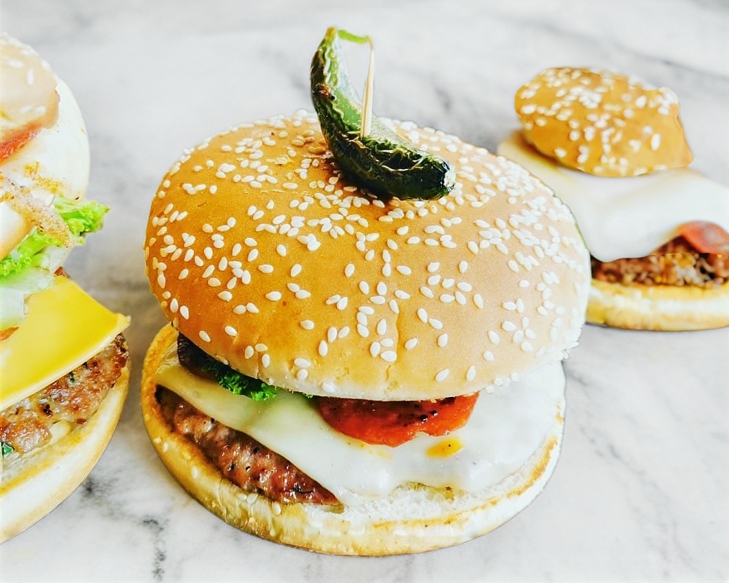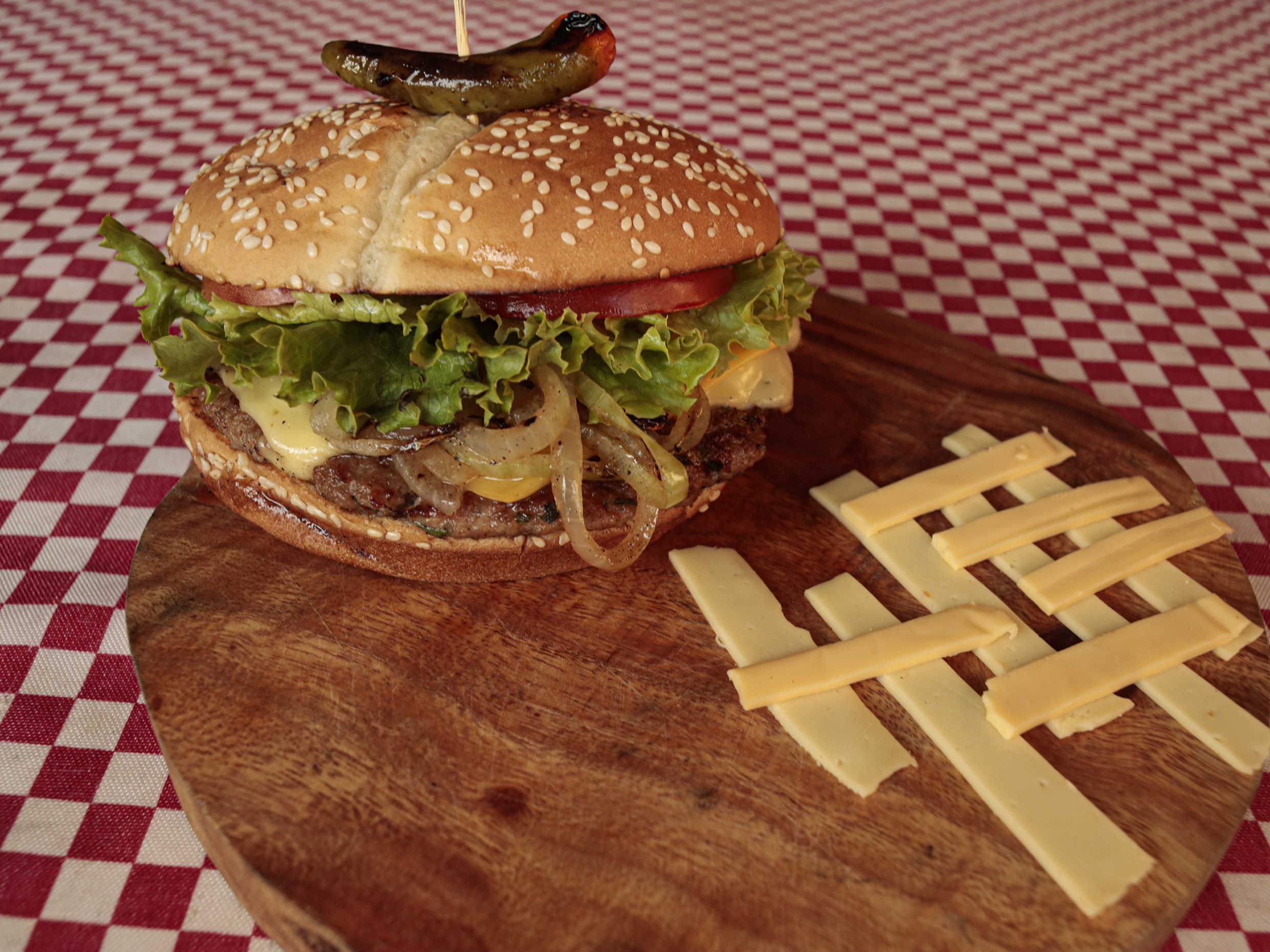 Una jugosa carne 100% casera, queso manchego y peperoni a la plancha