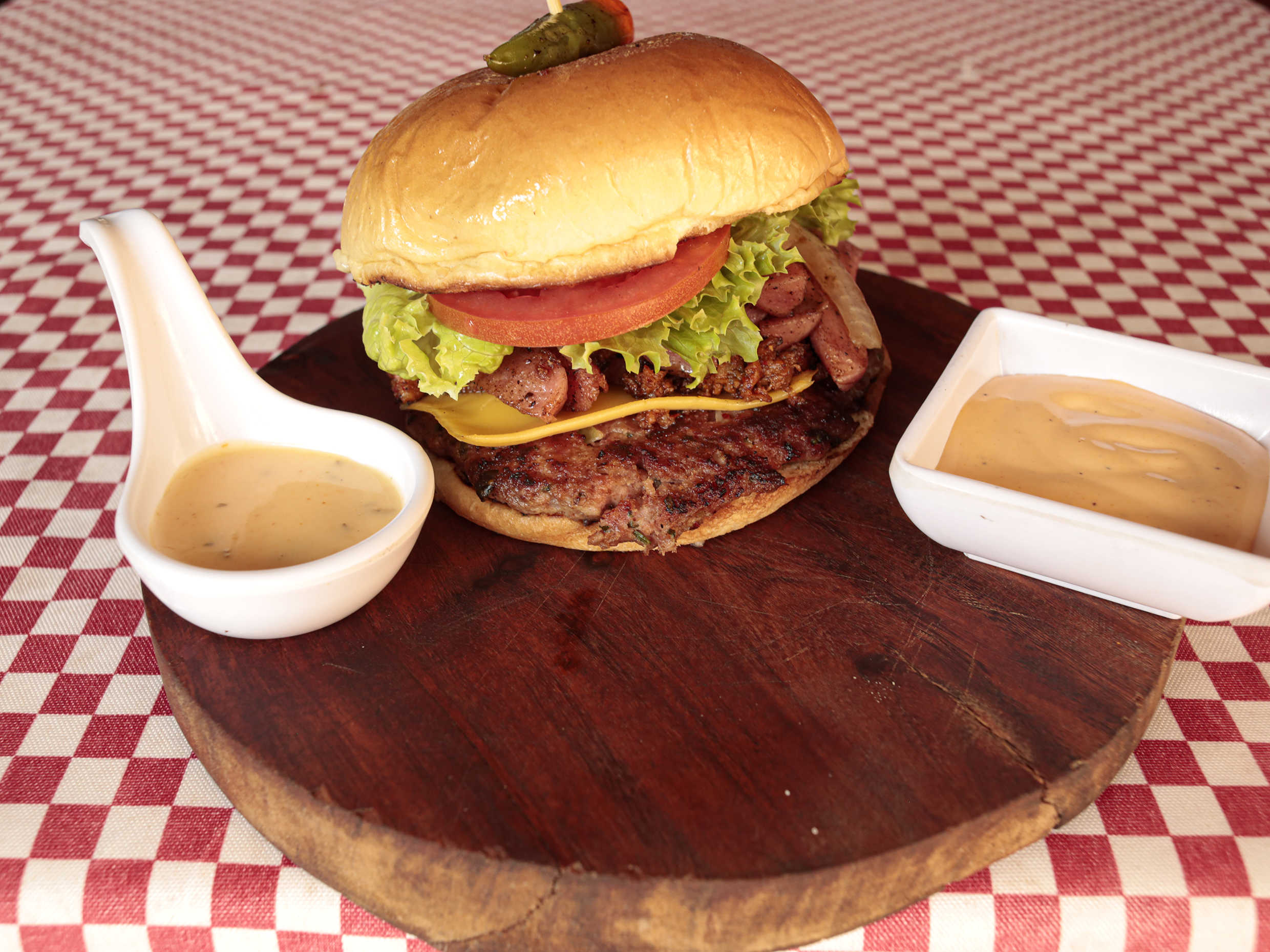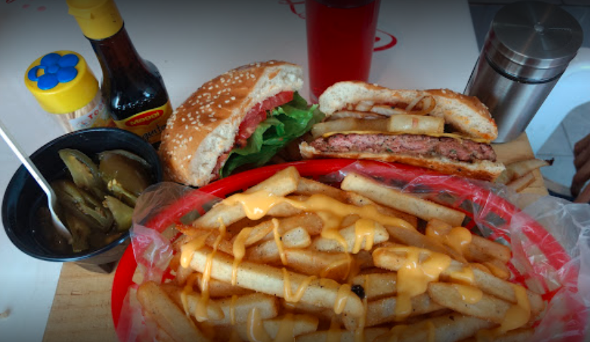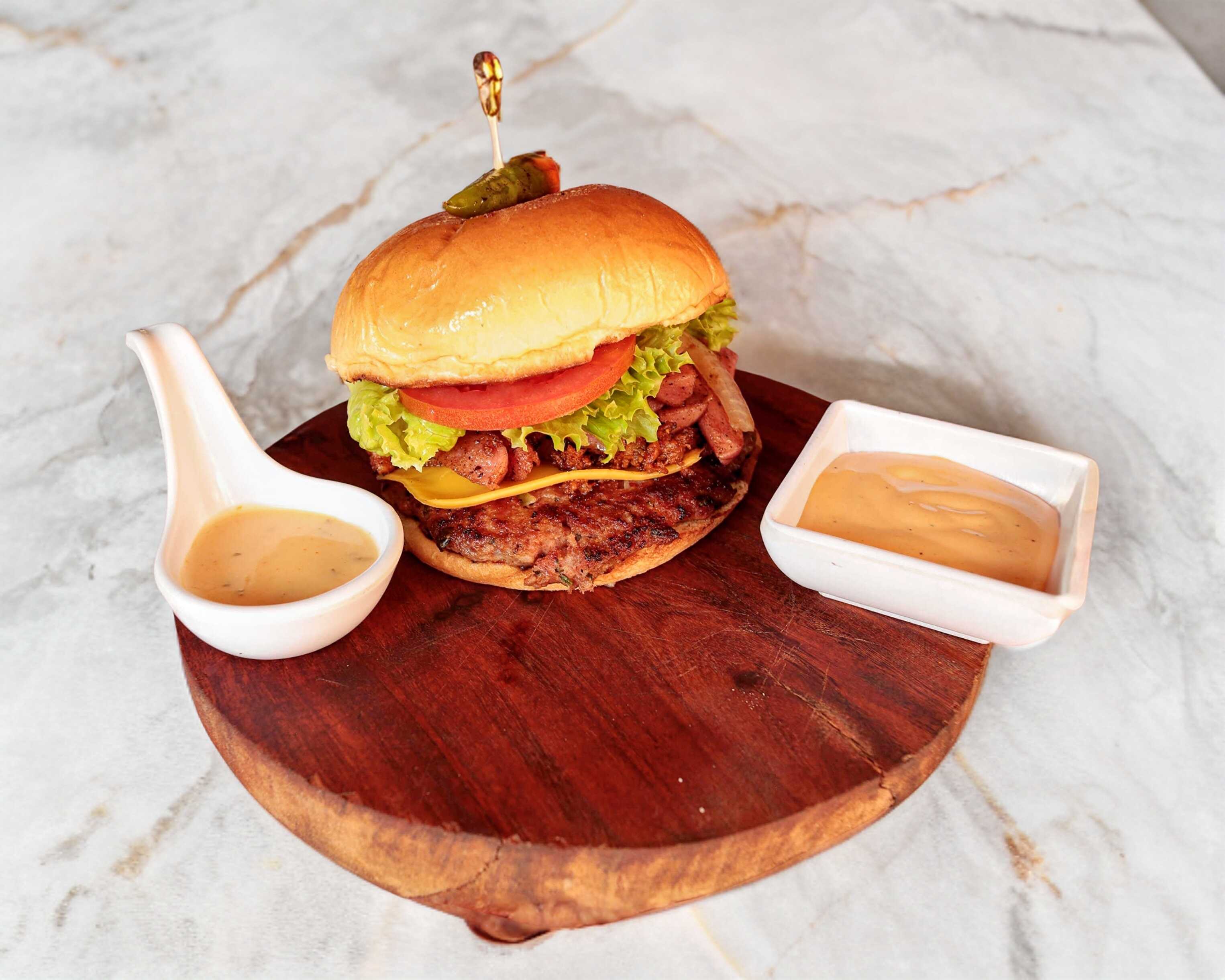 Un piso de carne 100% casera cubierto de queso amarillo, tocino y chorizo a la plancha , cebolla caramelizada , lechuga italiana y jitomate