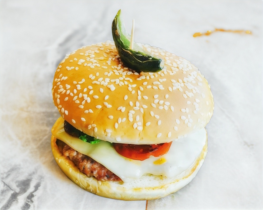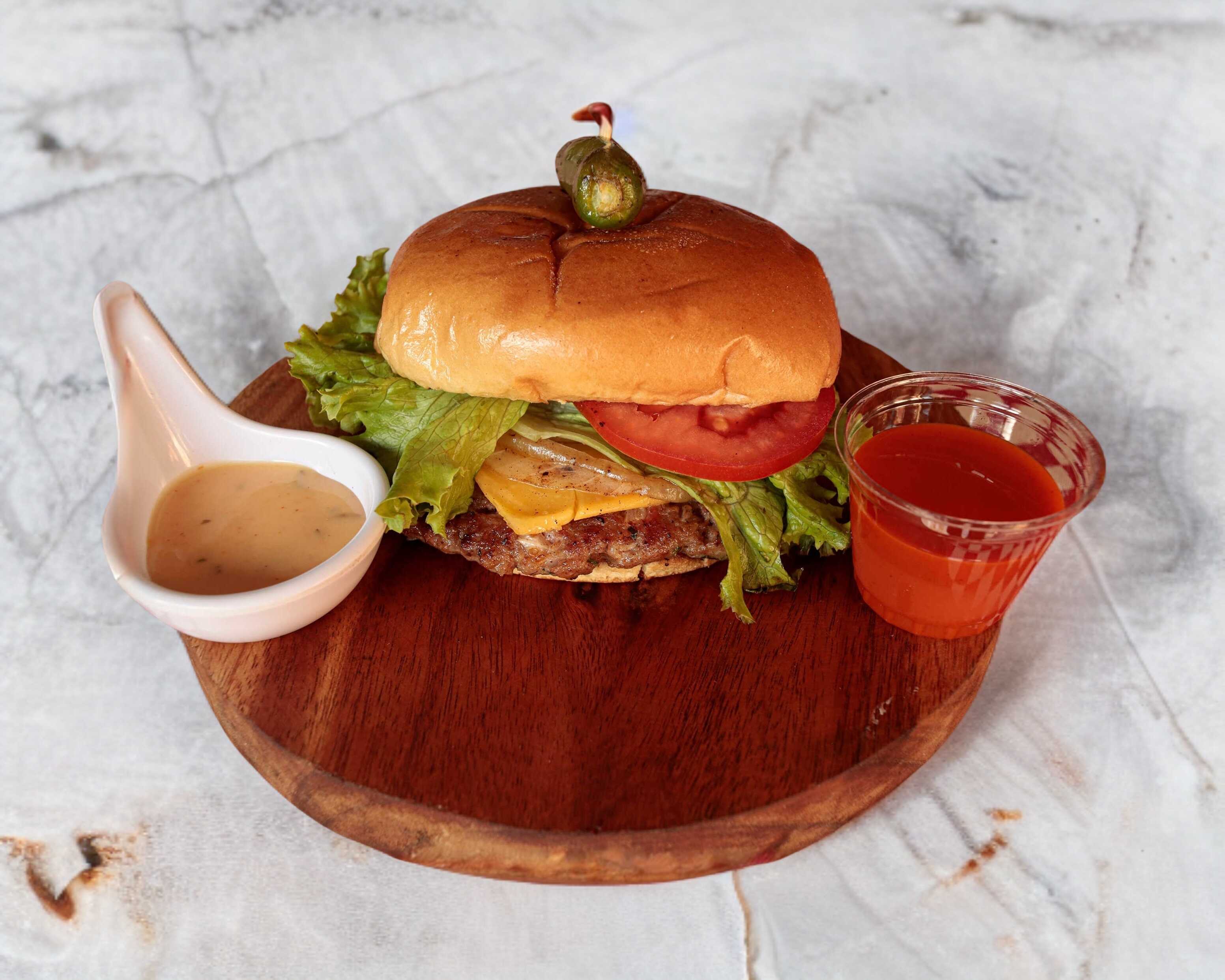 1 jugosa carne 100% casera a la plancha cubierta de queso amarillo cebolla caramelizada , jitomate , lechuga italiAna acompañado de un chile toreado