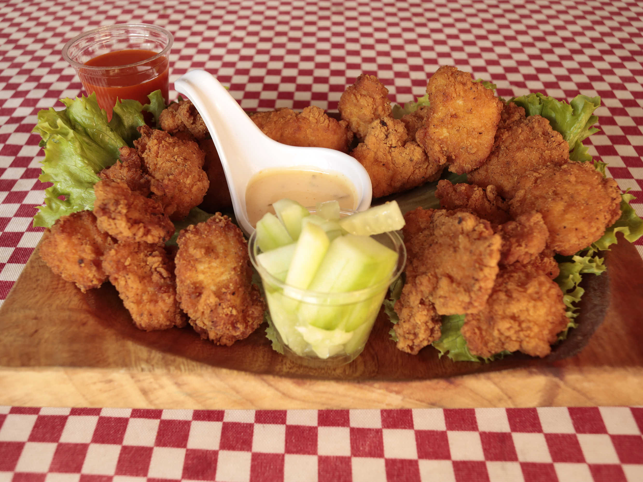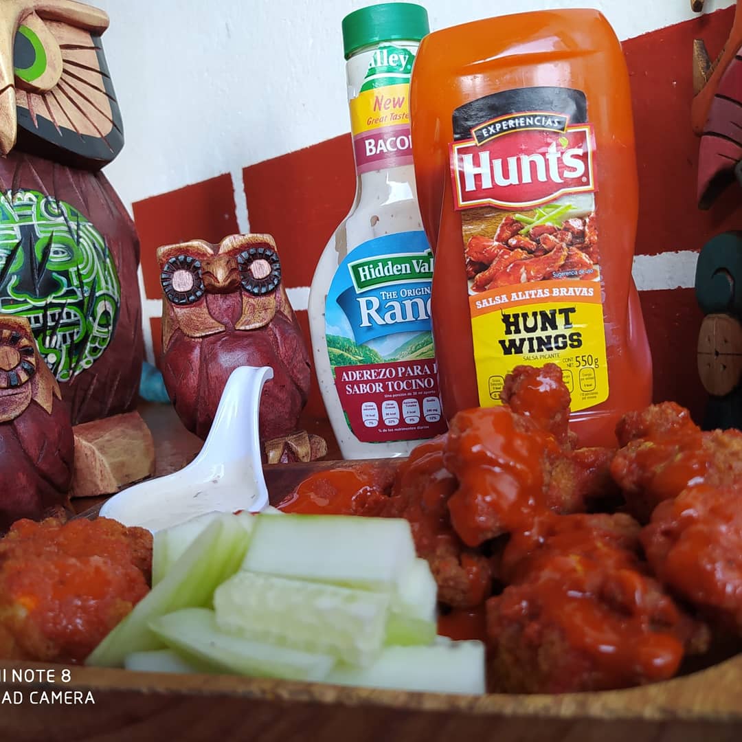 250 gramos de boneless picositas y acompañado de aderezo ranch y pepinos