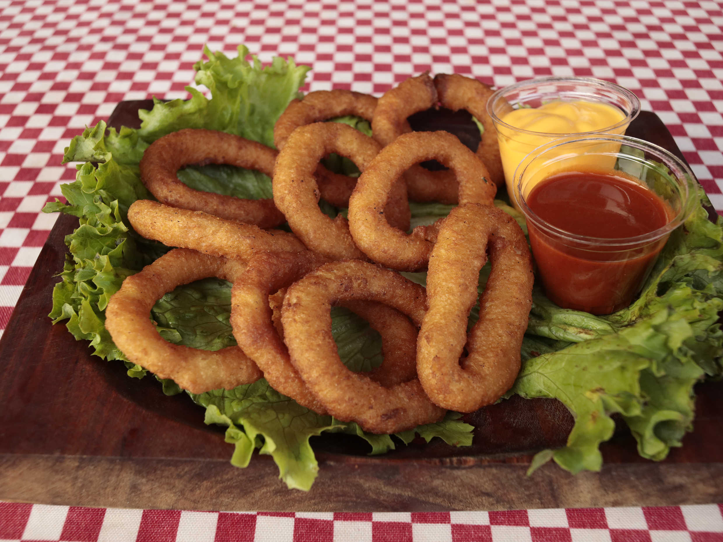 Riquisimos aritos de cebolla, 10 piezas por orden acompañados de salsa picante y queso