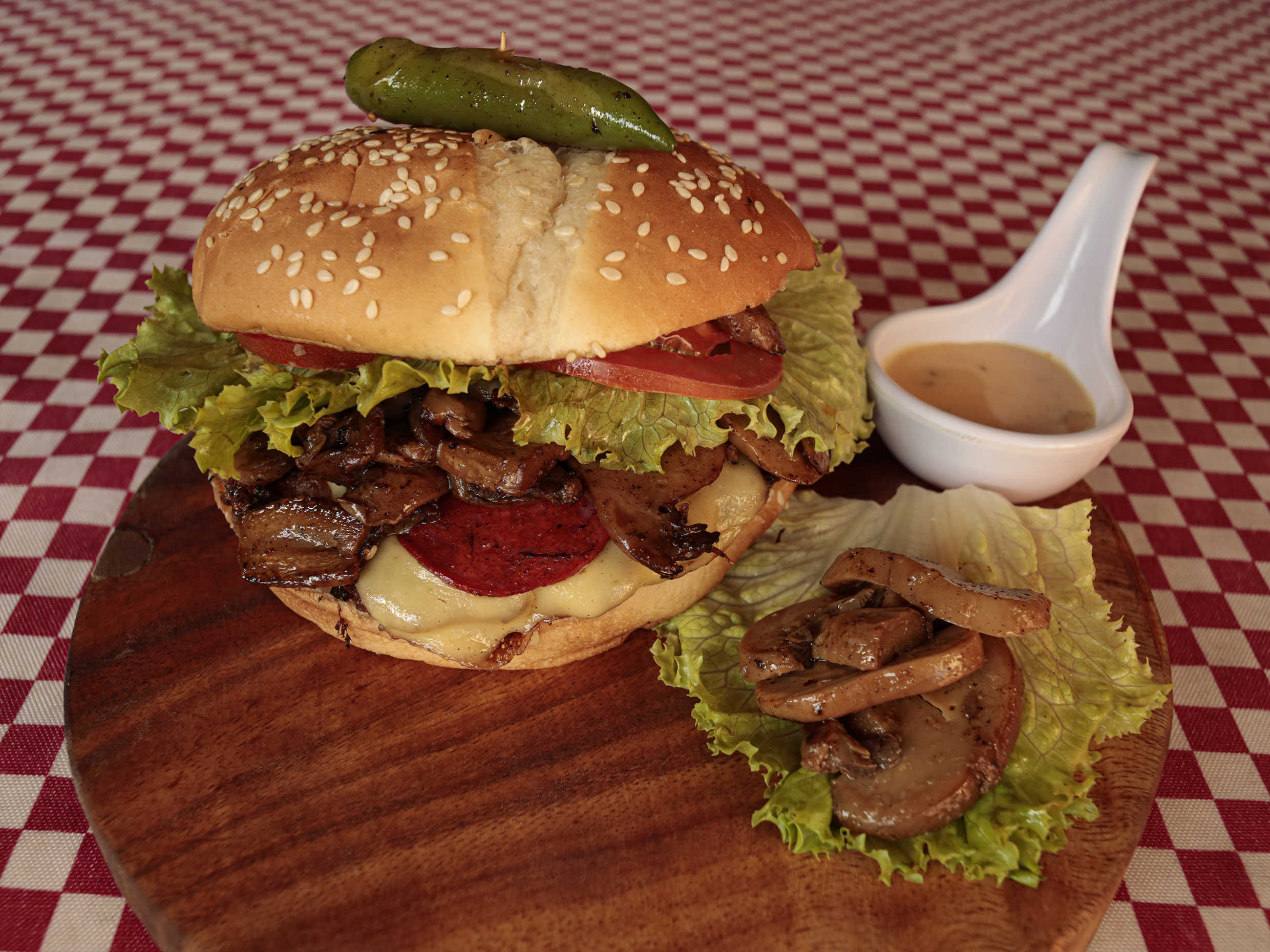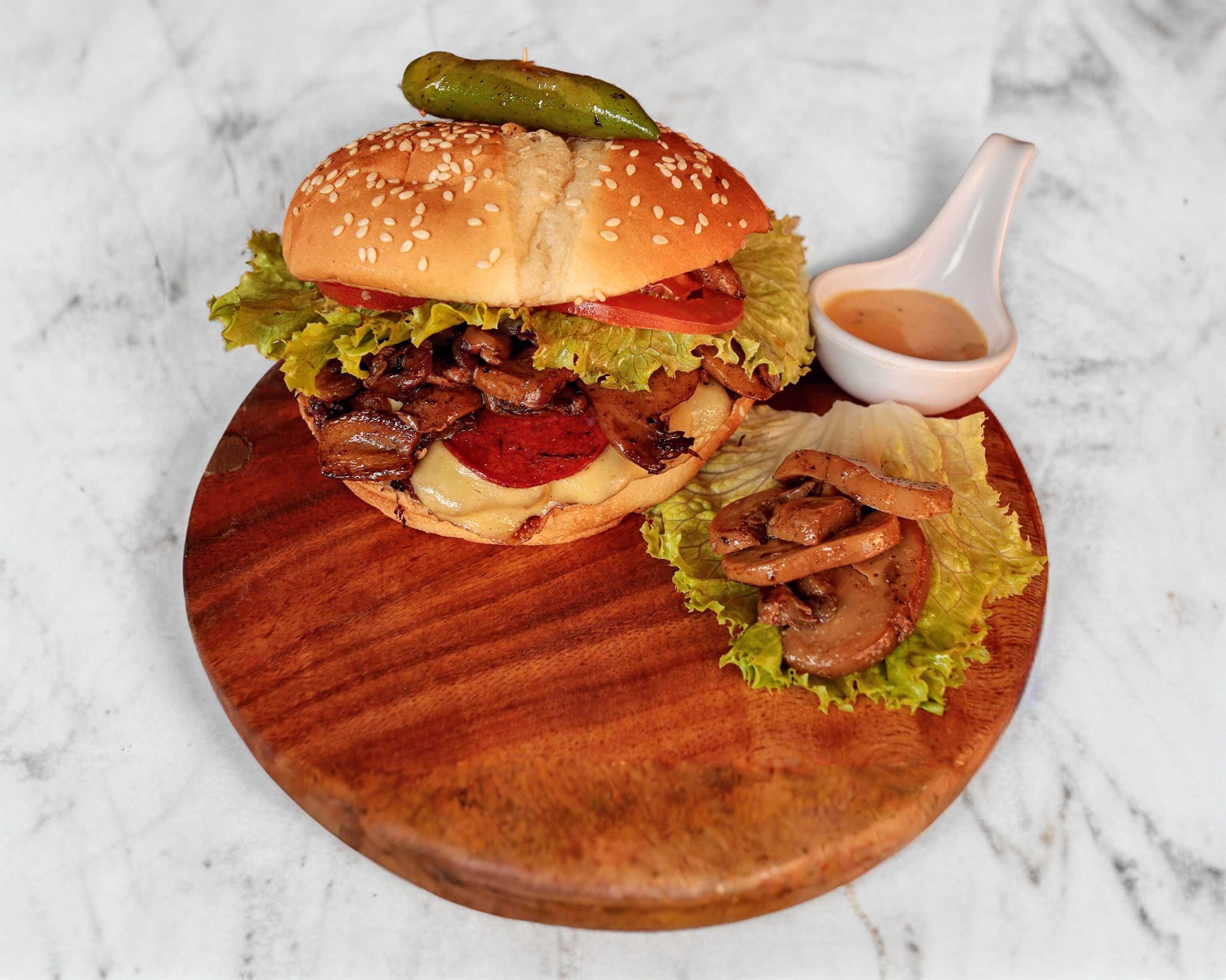 Jugosa Carne 100% casera, queso manchego fundido, champiñones y peperoni a la plancha