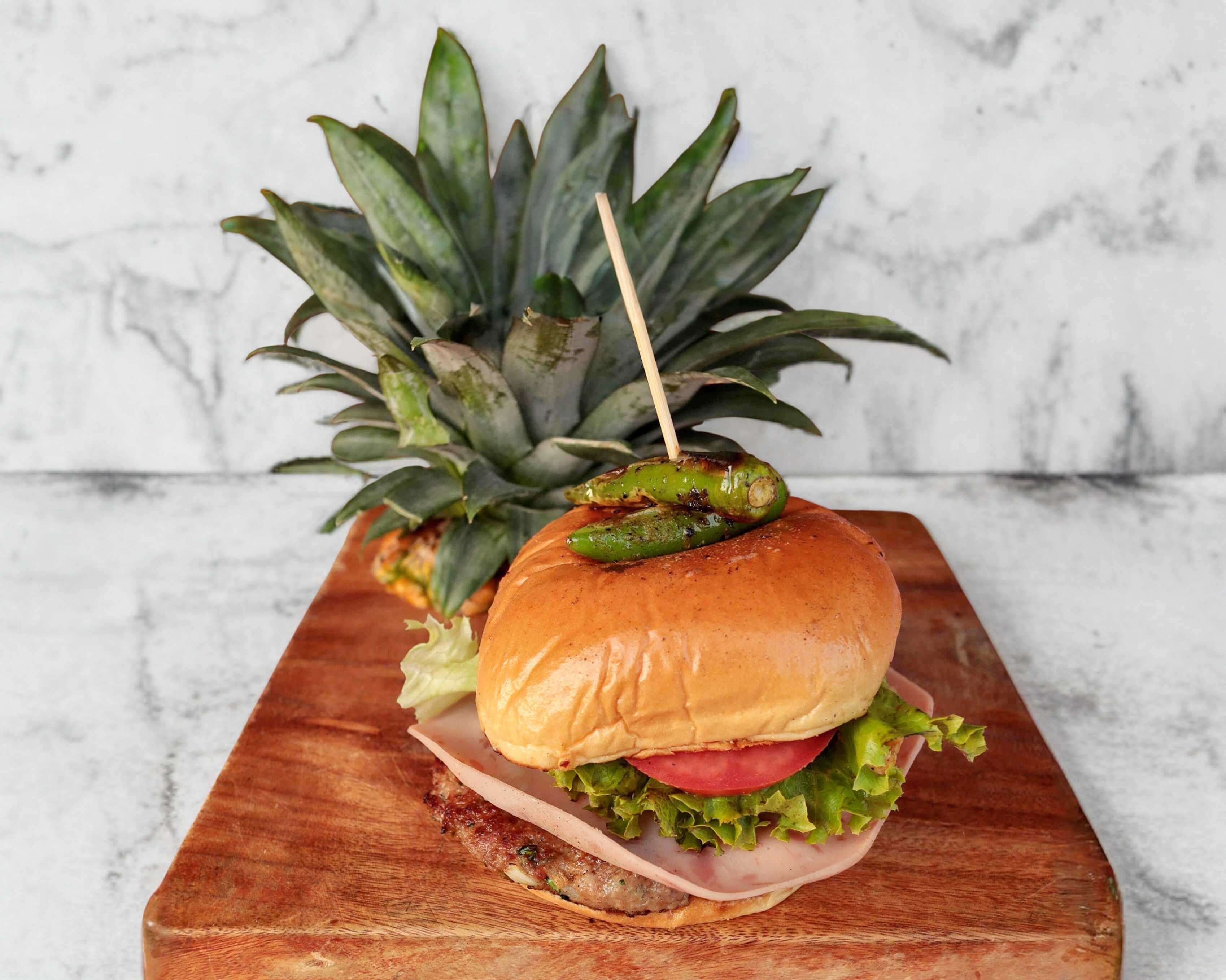 Carne 100% casera, queso amarillo, jamon de pavo y piña 100% natural con cebolla caramelizada, lechuga italiana y jitomate