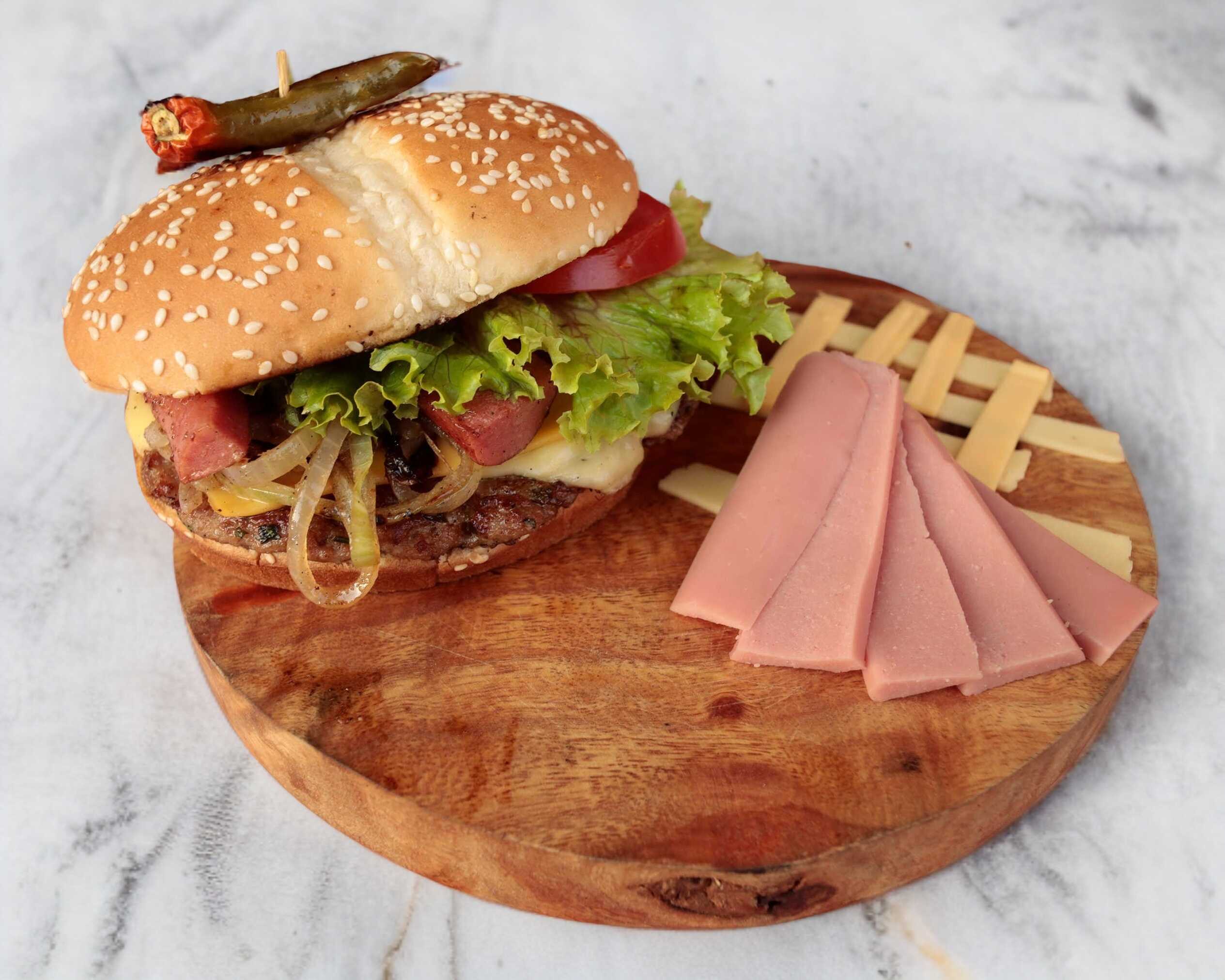 1 exquisita carne 100% casera con queso amarillo, 1 rebanada de jamón de pavo , peperoni a la plancha y cebolla caramelizada, jitomate y lechuga italiAna