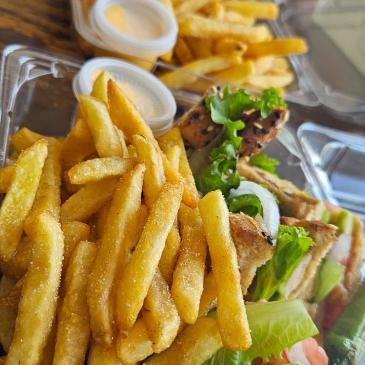 Un delicioso sandwich de pechuga de pollo con pan multigrano, cebolla , jitomate, lechuga italiana y un toque de aderezo de chipotle acompañado de papas a la francesa