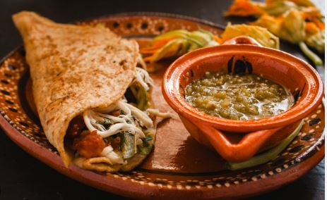 Pollo chorizo, morron, cebolla, queso Oaxaca, frijoles,lechuga, jitomate, aguacate, cebolla y chile