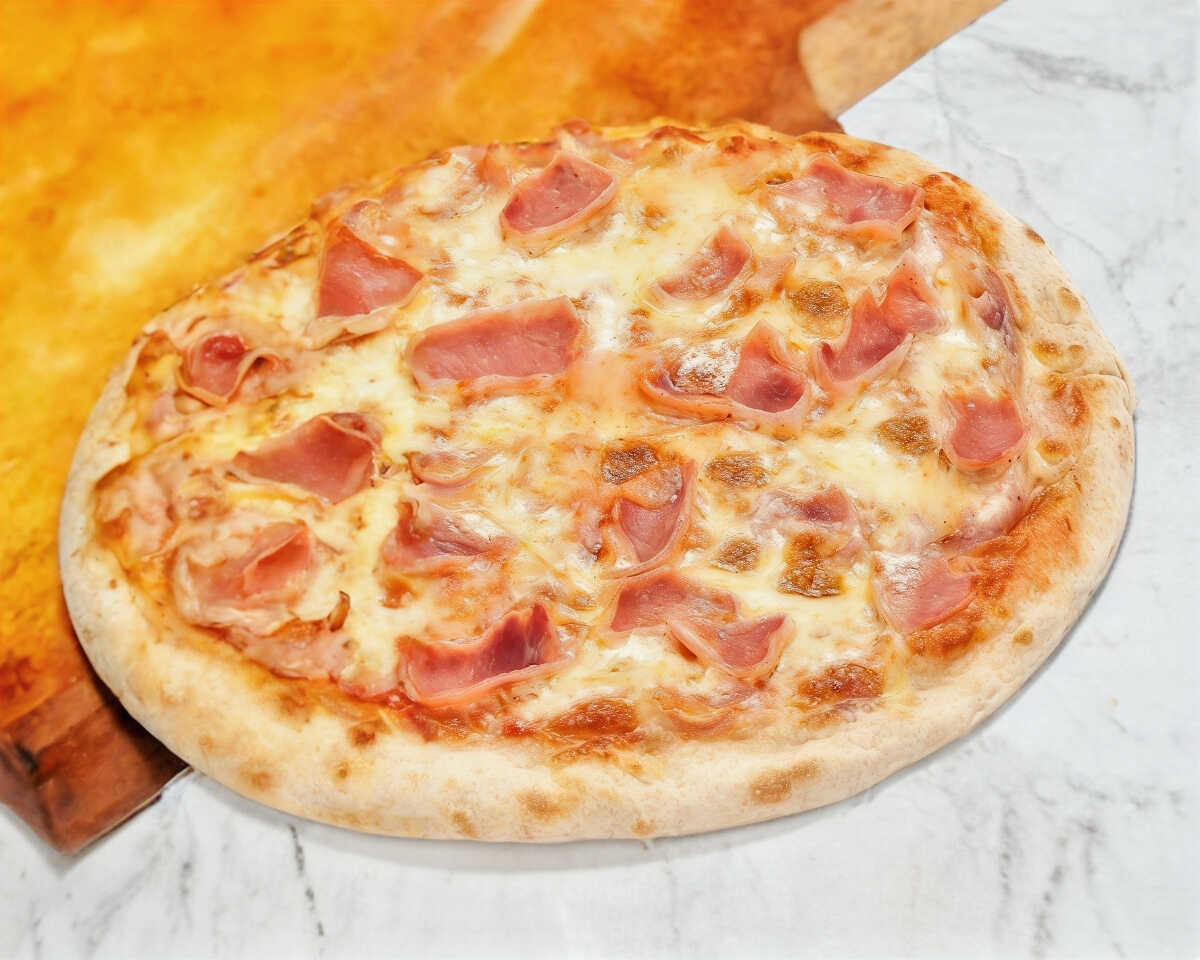 Pizza con base de puré de tomate, queso y jamón de pavo