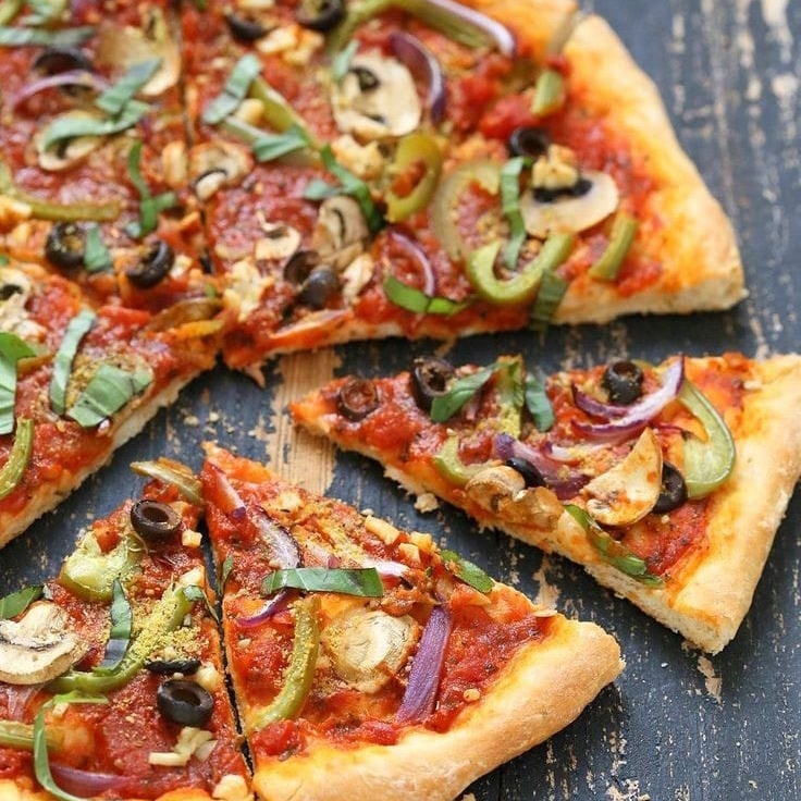 Salsa de tomate, queso mozzarella, aceituna, cebolla morada, pimiento, champiñones, aceite de oliva y especias.