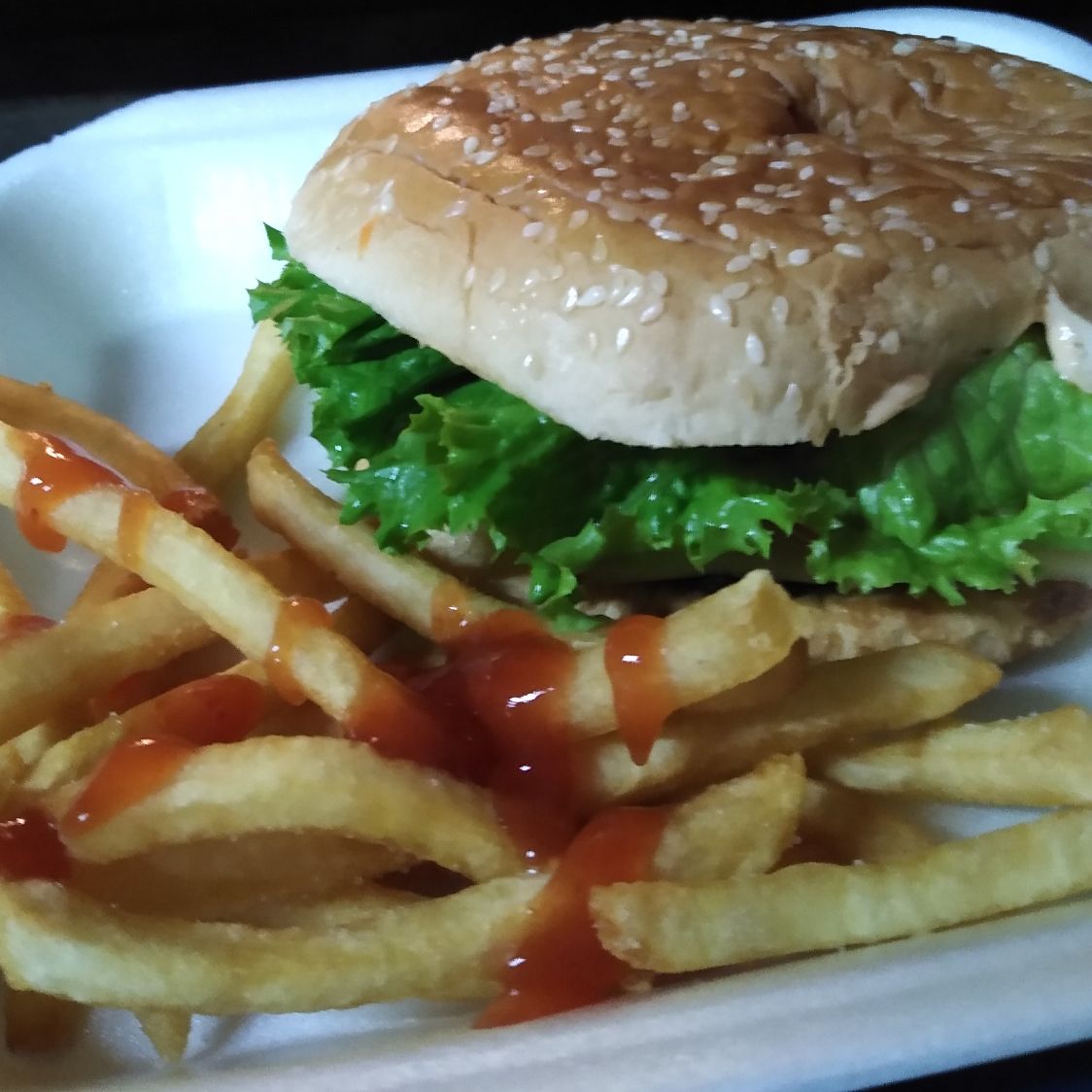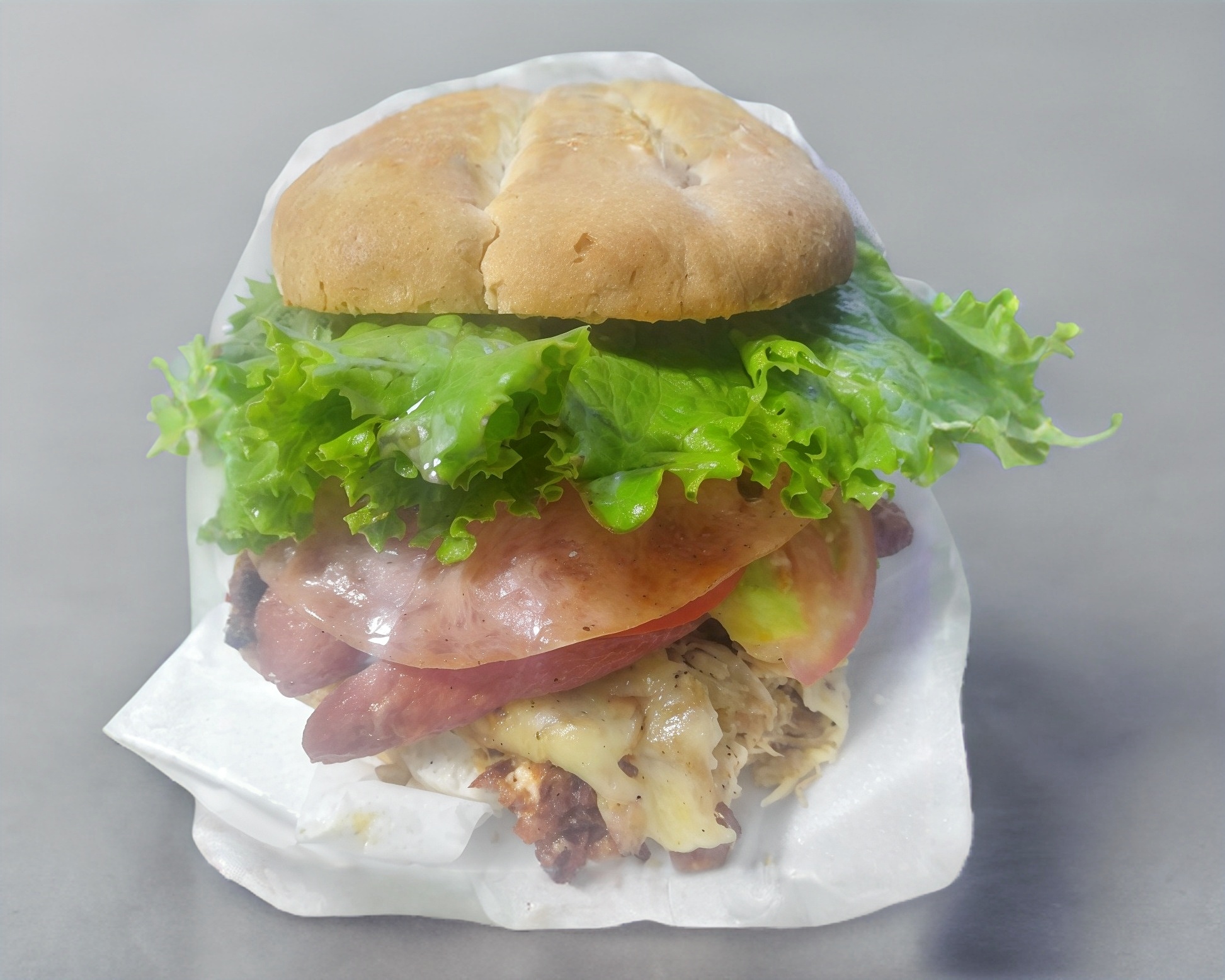 Hamburguesa con carne de 100%de pollo ,,queso manchego jitomate cebolla lechuga italiana aderezo ranch