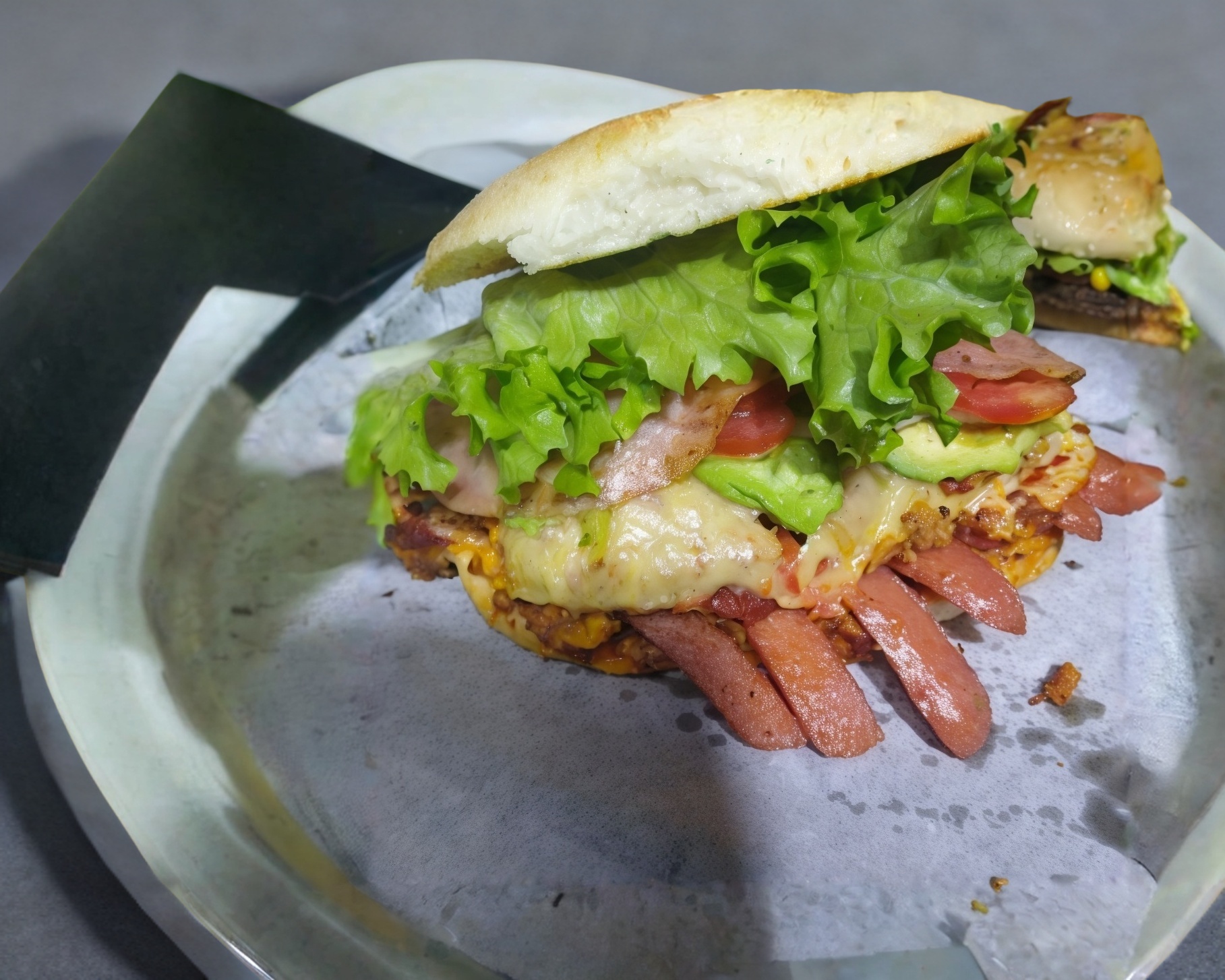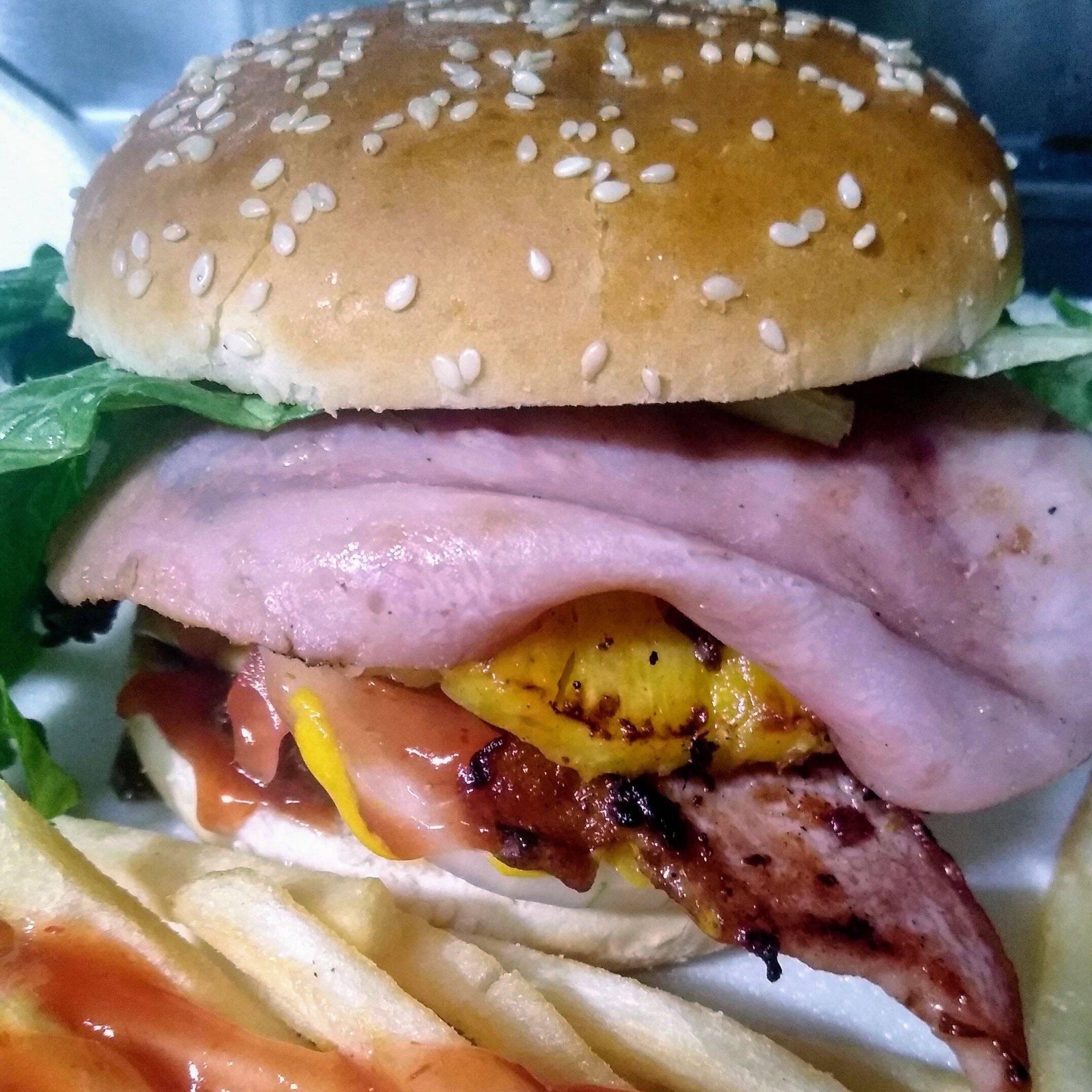 Hamburguesa con carne 100resqueso manchego piña,jamón, jitomate cebolla lechuga italiana y jalapeños