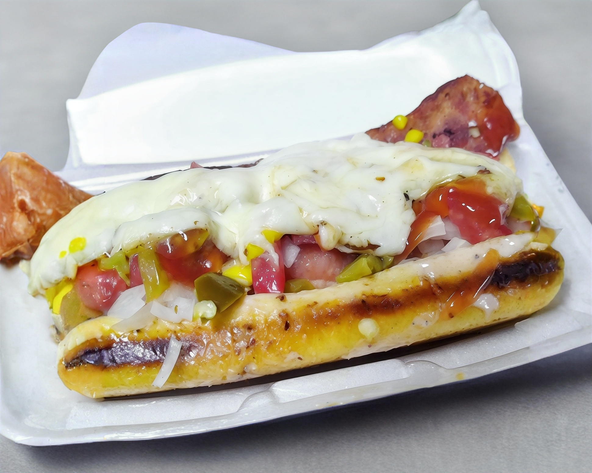 Pan de hot dog con salchicha aderezo jitomate cebolla catsup mostaza y jalapeño.