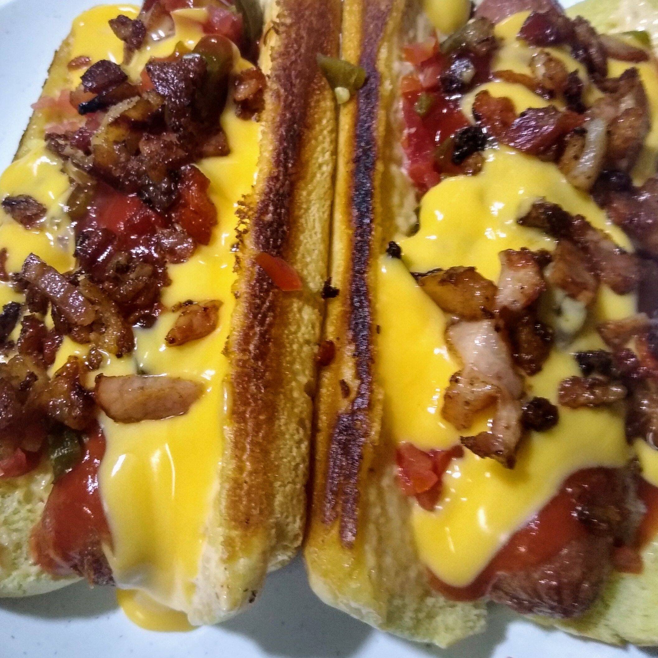 Carne de arrachera con doble queso manchego y amarillo, jitomate cebolla lechuga italiana y jalapeños