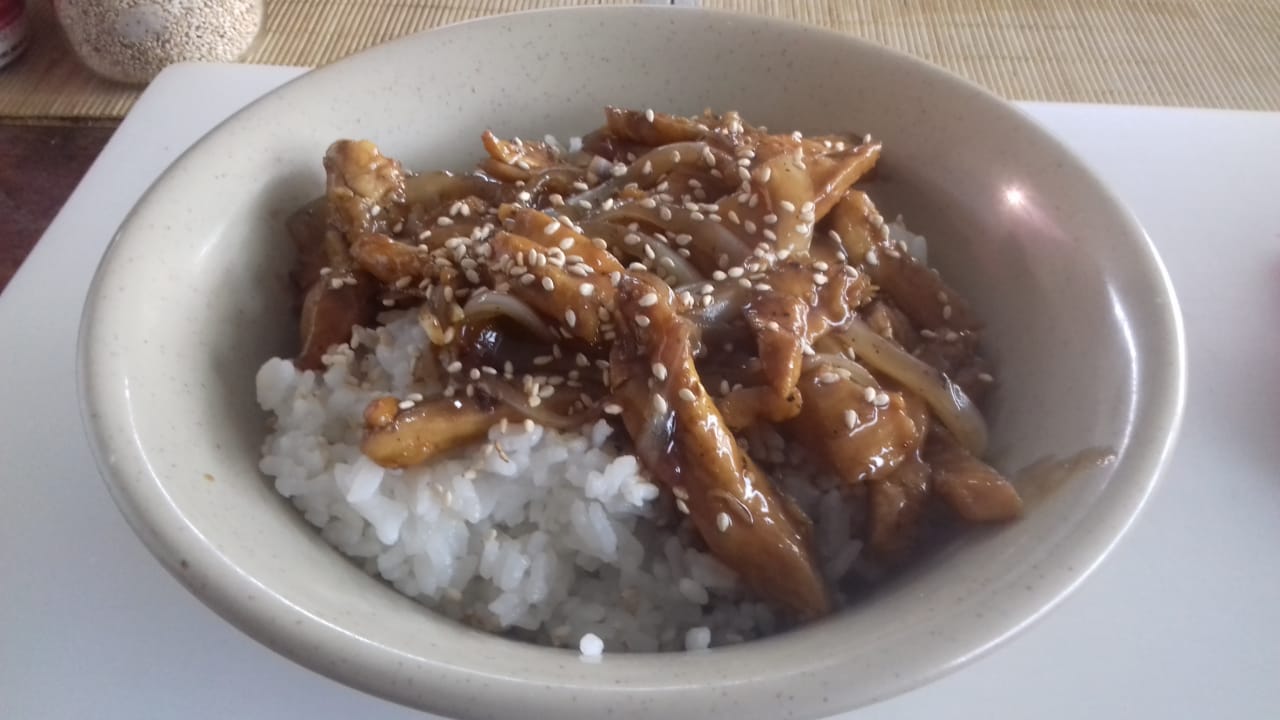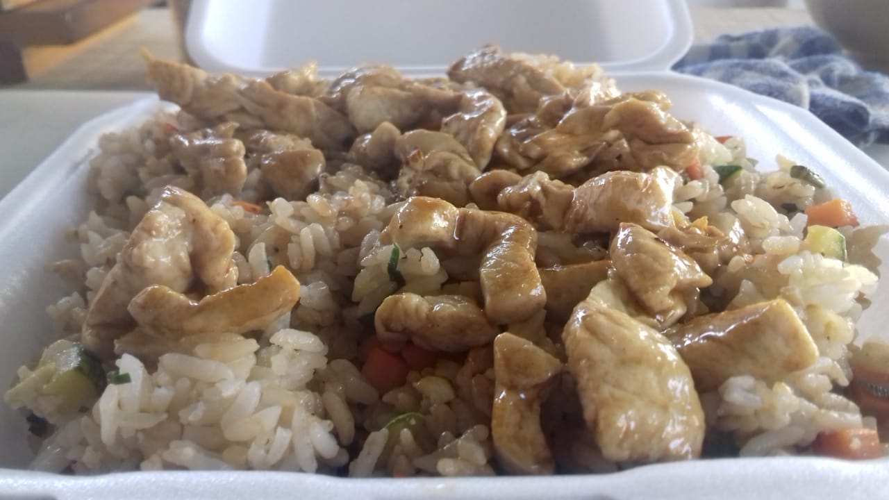 Arroz blanco o frito acompañado con pollo teriyaki.